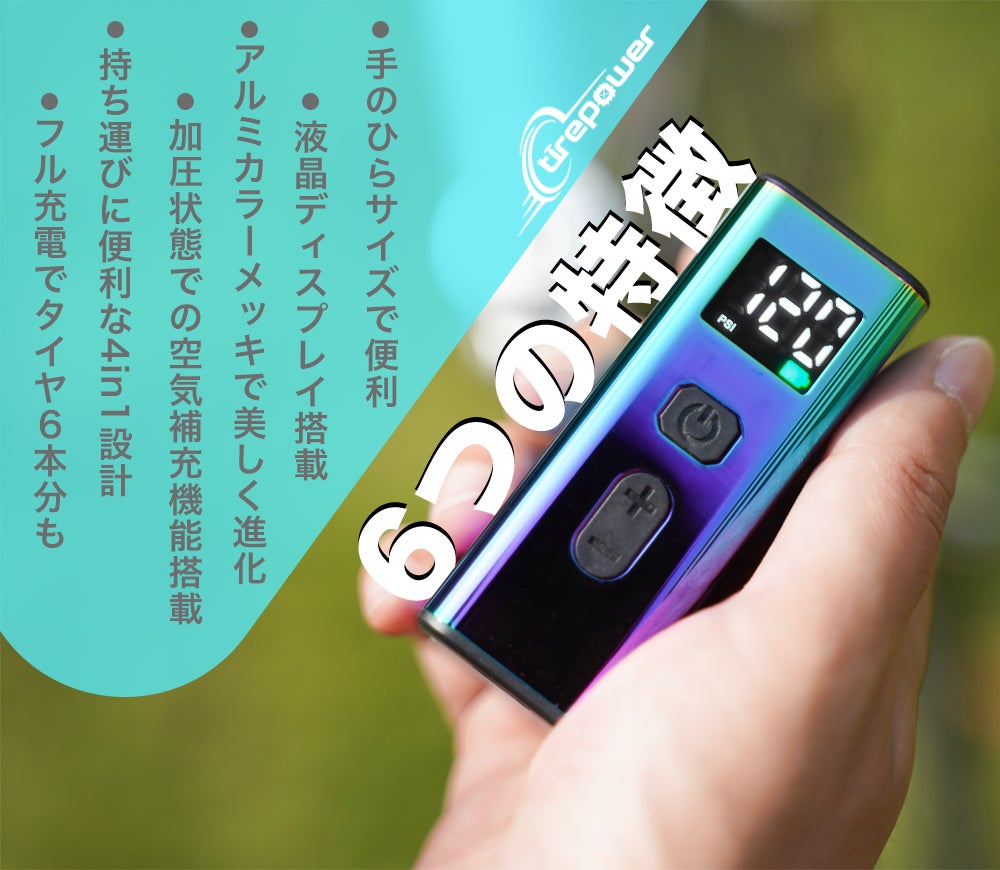 Tirepower(タイヤパワー)は、「Tire(タイヤ)」+「Power(力)」をテーマに、小型で軽量ながらも高性能な空気入れという全く新しい選択肢を提案します。日々の通勤・通学、自転車・バイク・車のタイヤメンテナンス、スポーツやレジャーまで、あらゆるシーンに寄り添う空気入れを目指し、日本の使いやすさへのこだわりと、確かな品質を形にしました。Tirepowerは、「空気入れ=重い・面倒」という固定概念を覆し、よりスマートで快適なユーザー体験を提供します。