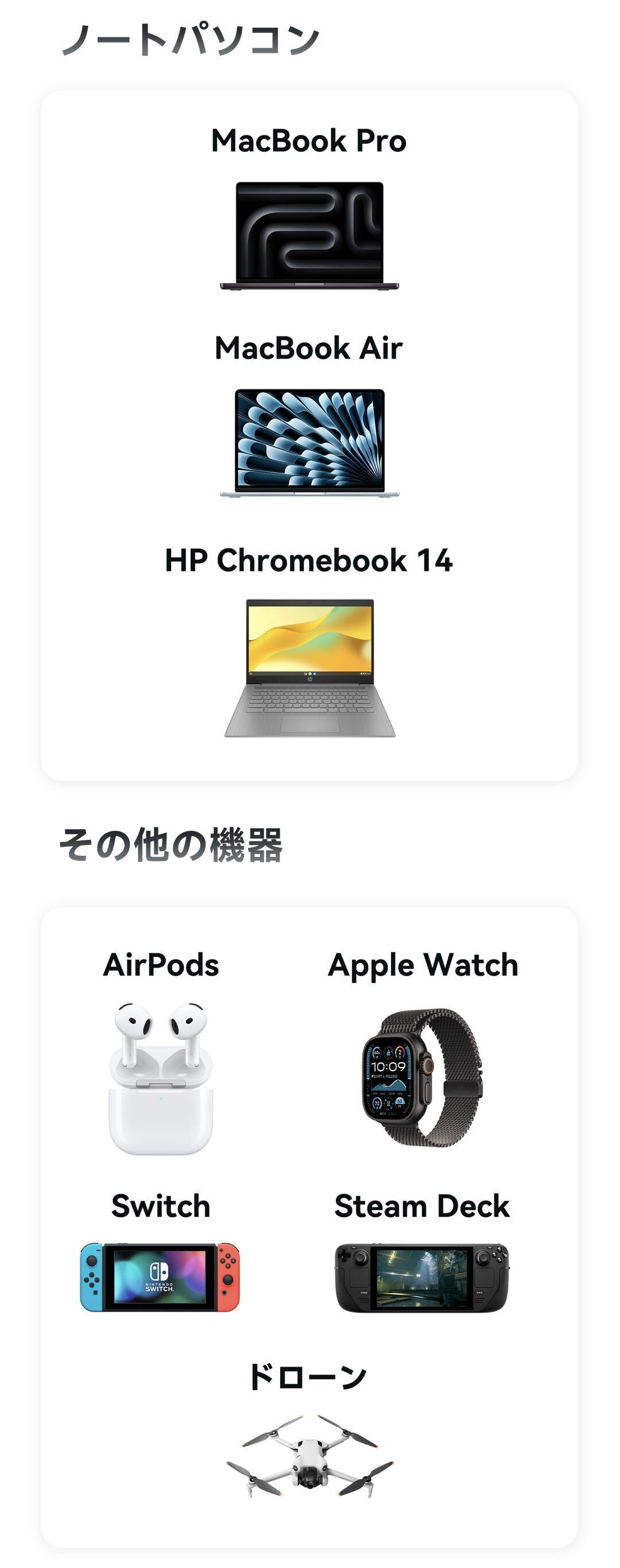 A: iPhone 15シリーズ、iPad(第10世代)、およびそれ以降のモデルのみが、バッテリー残量と型番の識別に対応しています。その他のデバイスでは充電機能は正常ですが、型番識別機能はサポートされていません。
