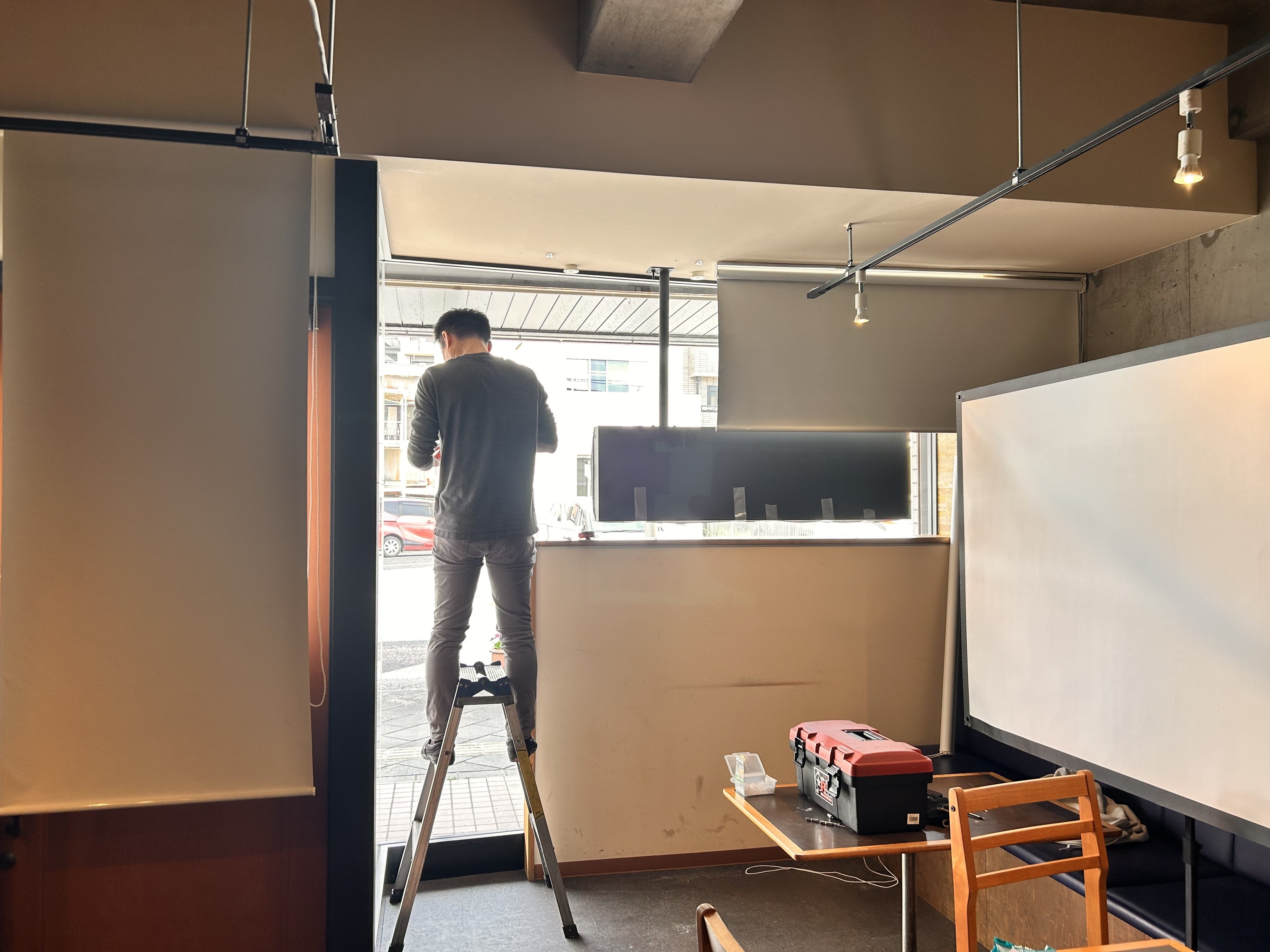 ロールカーテンを取り付ける聖人さん