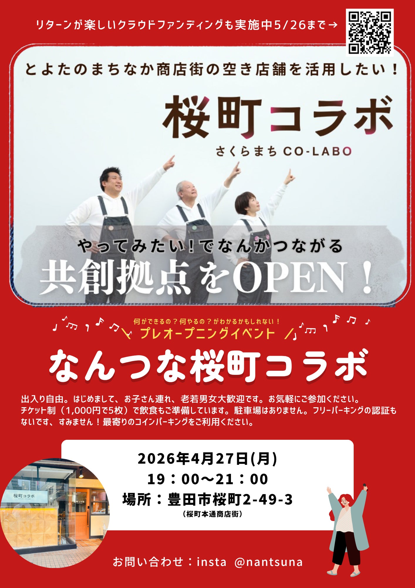 2026/04/21 21:51おにきです。桜町コラボのクラウドファンディング。スタートいたしました!!!早速、応援するよ!っていう声をたくさんいただき、ドキドキのスタートがポカポカのスタートになりました♡本当にありがとうございます!毎日ちょっとずつ準備を進めていましてお店にいると通りすがりの方とか、近くにいるからと連絡くれる方とかきてくれてちょっと手伝ってもらったり(無理やりかも!?)セカセカ作業したり、打ち合わせしていたりの私をよそに、まったりしてくれたりがとても嬉しいです。直近での告知ですみません。4月27日(月)プレオープニングイベントを行います。19:00〜21:00 出入り自由です。チケット制(1000円税込)で飲食もご用意しておりますのでなんつなを楽しんでください。チラシを添付いたします!場所は、豊田市駅東口から徒歩7分程度。わかりやすいのは、駅降りたらトヨタスタジアム方面にまっすぐ行って喜多町3丁目の黄砂店を左にいって、桜町一丁目の交差点を左に曲がると桜町本通商店街に入ります。もう直ぐです。googlemapで住所を検索すると裏の住宅のところが出ちゃうので検索は「なんつな桜町コラボ」で検索してみてください。 もっと見る