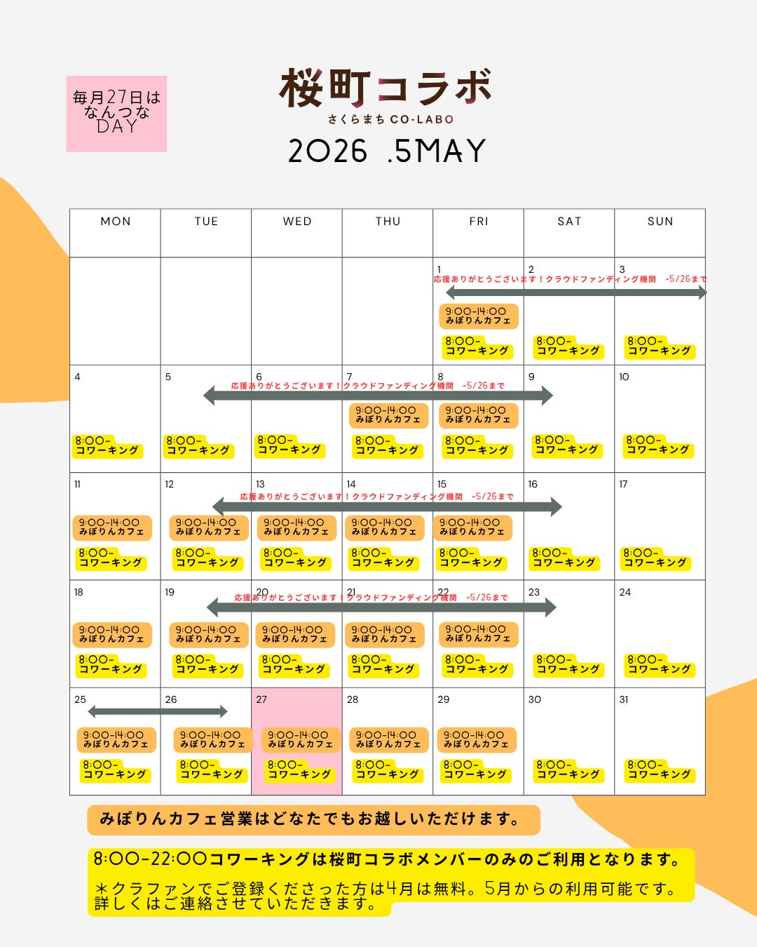 2026/04/28 05:14昨日は、プレオープニングイベントありがとうございました!!またレポさせていただきますが、想像以上に沢山の方々が来てくれて、なんつな市民活動センタースタッフさんもたくさんお手伝いしてくださって、私がパニックになっておりしたが、とっても楽しいなんつなになりました。感謝でいっぱいです!!さて、今日からプレオープニング期間で、平日昼間のカフェ営業がスタートします。4月は28日火のみ。5月ゴールデンウィーク明けから、平日9:00-14:00 みぽりんのカフェ営業and管理人人生(大げさ?!)がスタートします。子育てもあり、なんと10年のブランクがあるみぽりん。ちゃんとできるかな話すのが苦手なんですドキドキと、チャレンジへの不安な声が聞こえてきておりますがなんつな桜町コラボは、挑戦を応援し合う場!ぜひみなさま、温かい目で応援ください!!Instagram開設しました。桜町コラボInstagram もっと見る