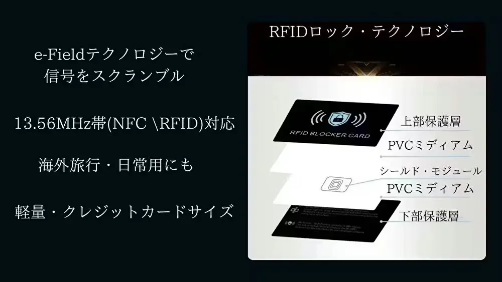 • 🛡️ 1枚で財布ごとガード:特殊なe-Field電波防御ゾーンを形成。財布に入れるだけで周囲のカードをまとめて保護します。