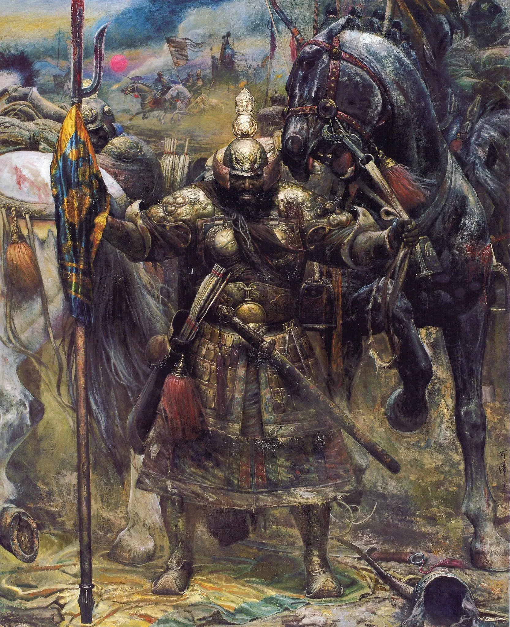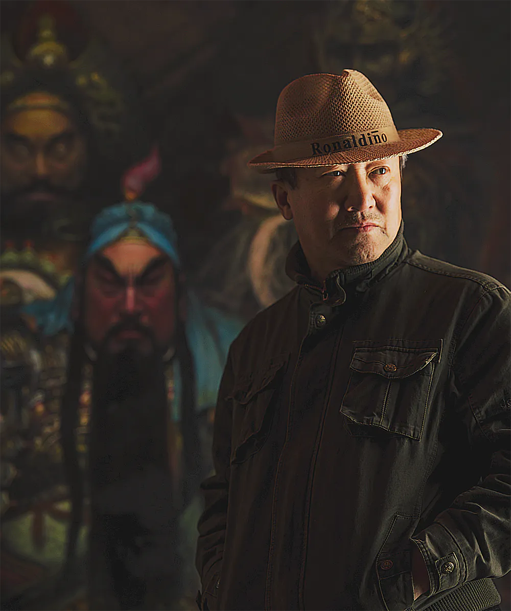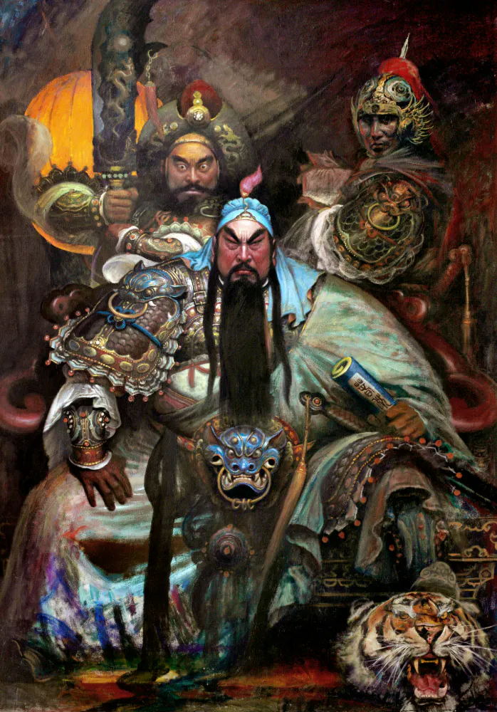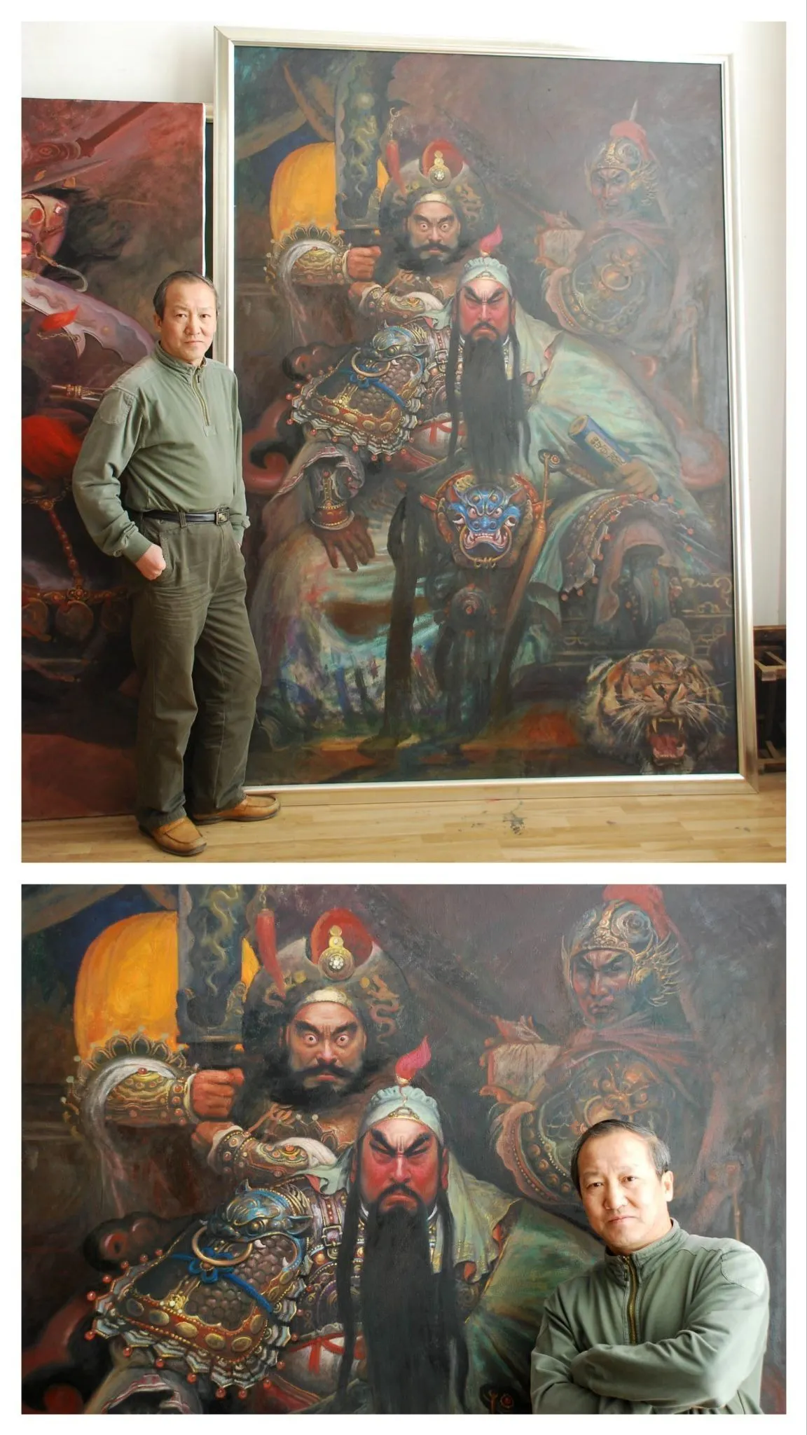油彩画作品『武聖』は2015年制作で、サイズは170cm × 245cmである。画面の中心には関羽が描かれ、左に周倉、右に関平が配されている。彼らは護衛であると同時に忠実な随従でもある。関平は関羽の義子で、落ち着いた性格で常に側に仕え、最も親しい随従の一人である。周倉は勇猛さで知られ、荒々しい姿で描かれ、直接的で忠実な武力の支えを象徴している。三者の関係性は、安定感と力強さを備えた構造として画面に表現されている。彼らは単なる主従関係にとどまらず、視覚的にも互いを支え合いながら層次的に英雄的オーラを構成している。