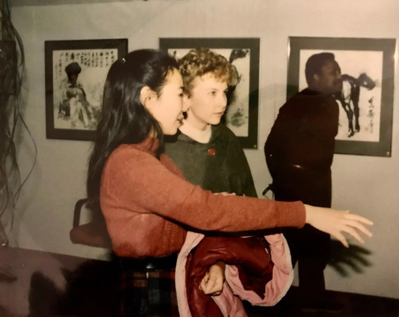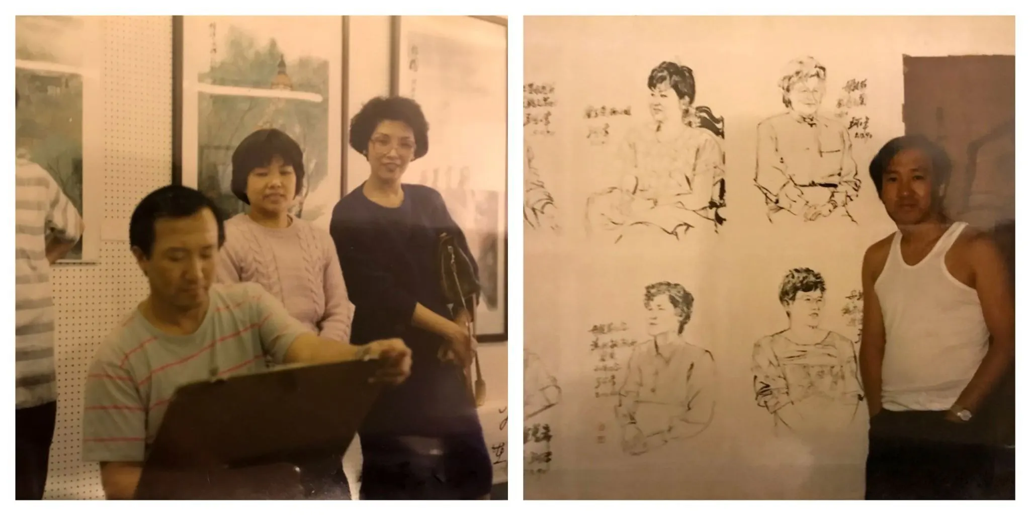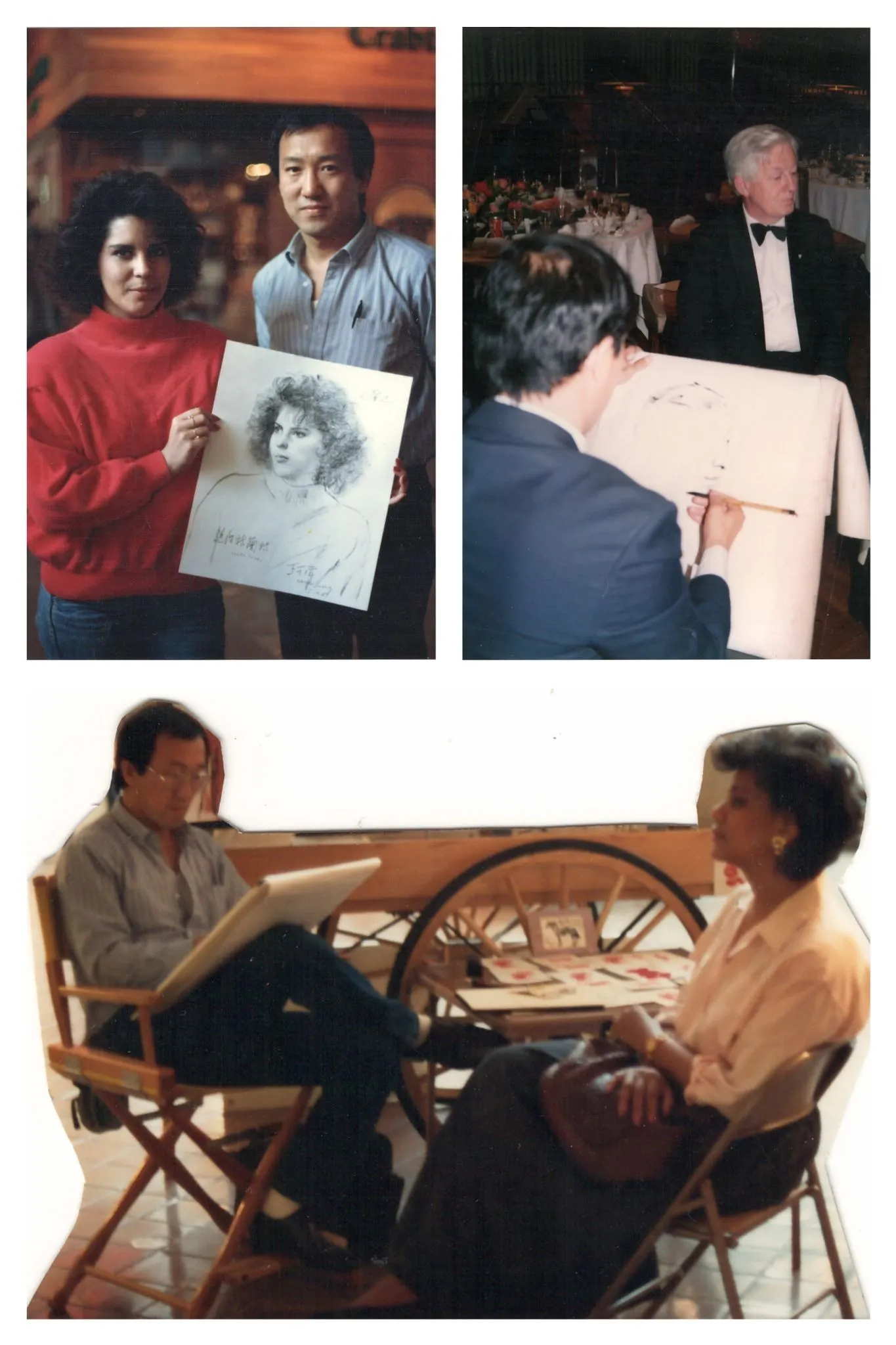 (1990年6月、ロサンゼルスにて個人中国画展を開催し、会場にて水墨人物写生の実演を行う。)