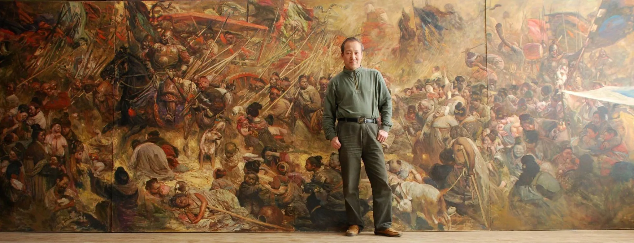 油彩画作品『兵車行』第二版は、2004年から2009年の5年間をかけて完成したもので、サイズは690cm × 220cmと、画家の制作活動の中で最大規模の作品である。制作のインスピレーションは、中国の詩人杜甫の同名詩に由来する。本作は、戦争による徴兵が民衆にもたらす苦悩と別れの悲しみを主題としている。出征する兵士を見送る場面を通して、民衆が強制的に兵役につかされ、家族が引き裂かれる悲惨な現実を描き出すとともに、連年続く戦争への深い憂慮と批判を表現している。