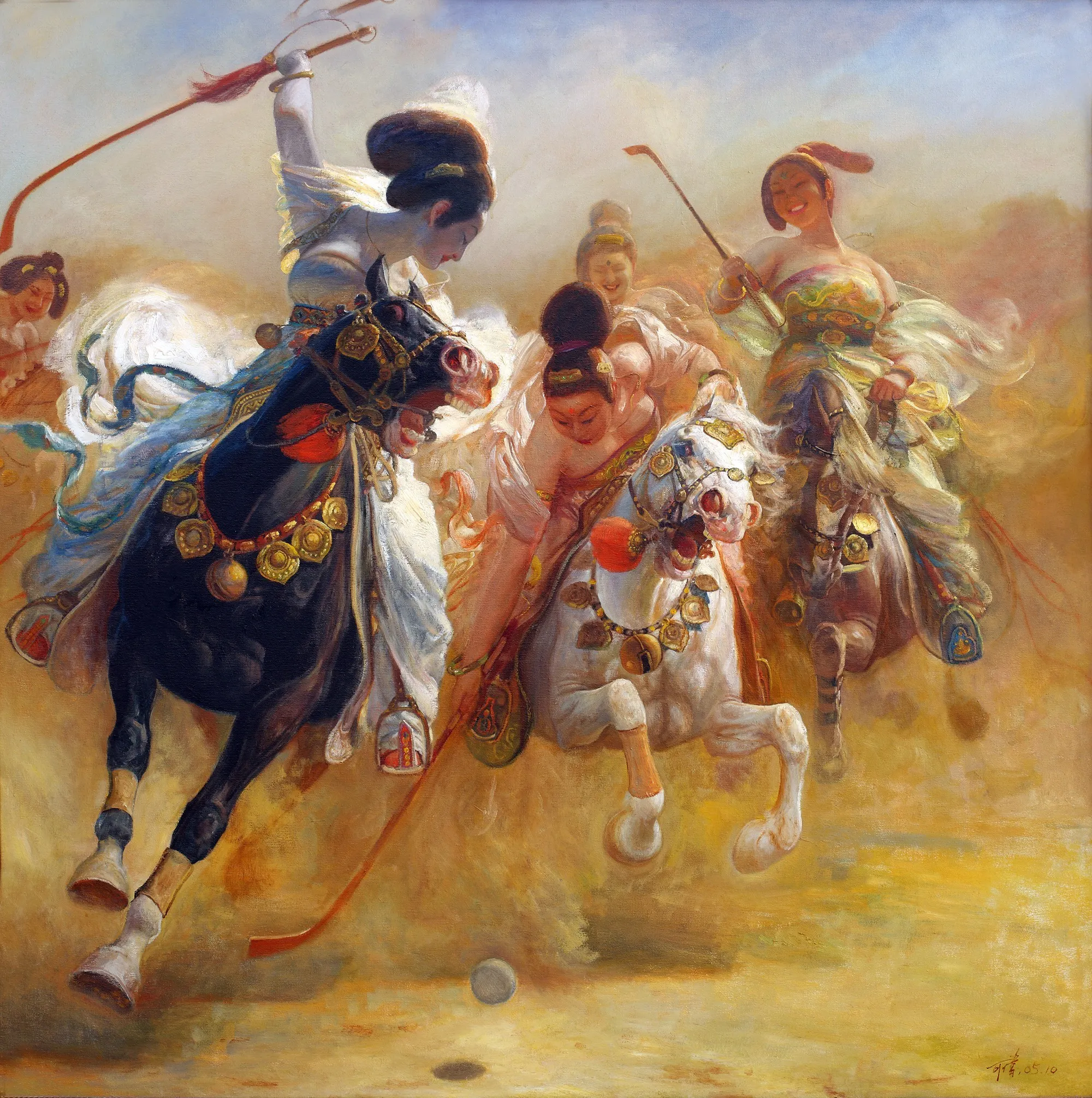 油彩画作品『ポロ競技』は2005年制作で、サイズは180cm × 180cmである。画面には唐代の宮廷女性たちが馬に乗り、疾走しながらポロの球を打つ姿が描かれており、表情は集中しつつも軽やかで楽しげである。駿馬が駆け、衣の裾が舞い上がり、土ぼこりと光影が交錯して、熱気とリズムに満ちた場面を演出している。競技の緊張感とスピード感がありながら、盛唐期の女性たちの自信と優雅さも溢れている。