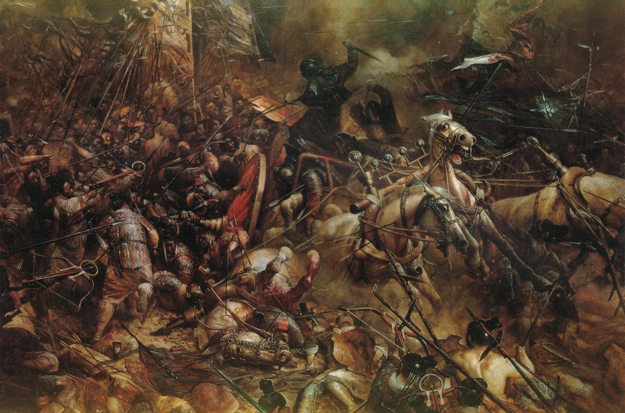 油彩画作品『戦神』は2003年制作で、サイズは180cm × 220cmである。画面には甲冑をまとった将軍が戦場の中央に立ち、表情は毅然としている。傍らでは戦馬が嘶き、塵と硝煙が立ち込める。遠方では旗が翻り、騎兵が突撃する光景が描かれ、全体に緊張感と壮烈さが漂い、戦意と力強さに満ちた場面となっている。