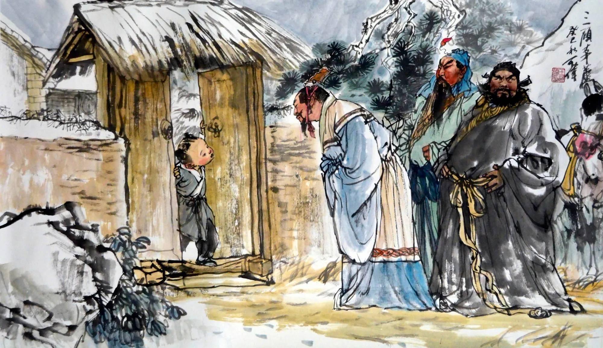 中国画作品『三顧の草庐』は2013年制作で、サイズは123cm × 70cmである。画面は、劉備が賢才を求め、隠居する諸葛亮を三度にわたり草庐へ訪ねる様子を描き、誠意と謙虚さを強く表現している。最終的に諸葛亮の心を動かし、蜀漢の事業を共に開くこととなる場面を描写している。