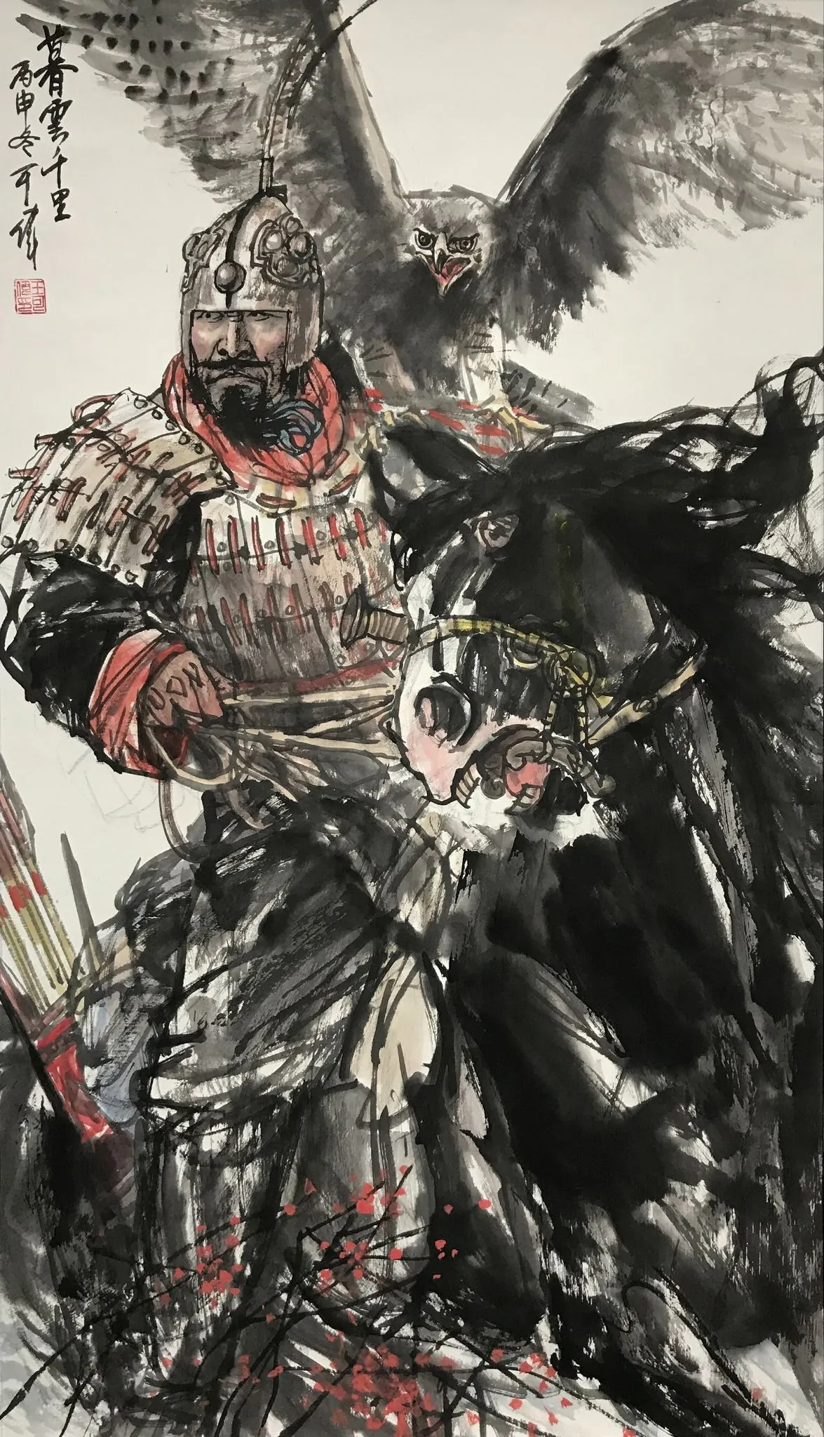 中国画作品『暮雲千里』は2016年制作で、サイズは70cm × 122cmである。画面には将軍が馬を勒(しば)り、遠方を見据える姿が描かれ、表情は沈着で毅然としている。広大な天地の中で、風雲の変化を一人で受け止めるかのようである。肩に鷹が止まり、戦馬が低く嘶く様子が、動と静の間に戦場をくぐり抜けた冷厳さと孤独感を漂わせている。
