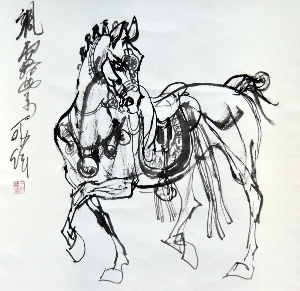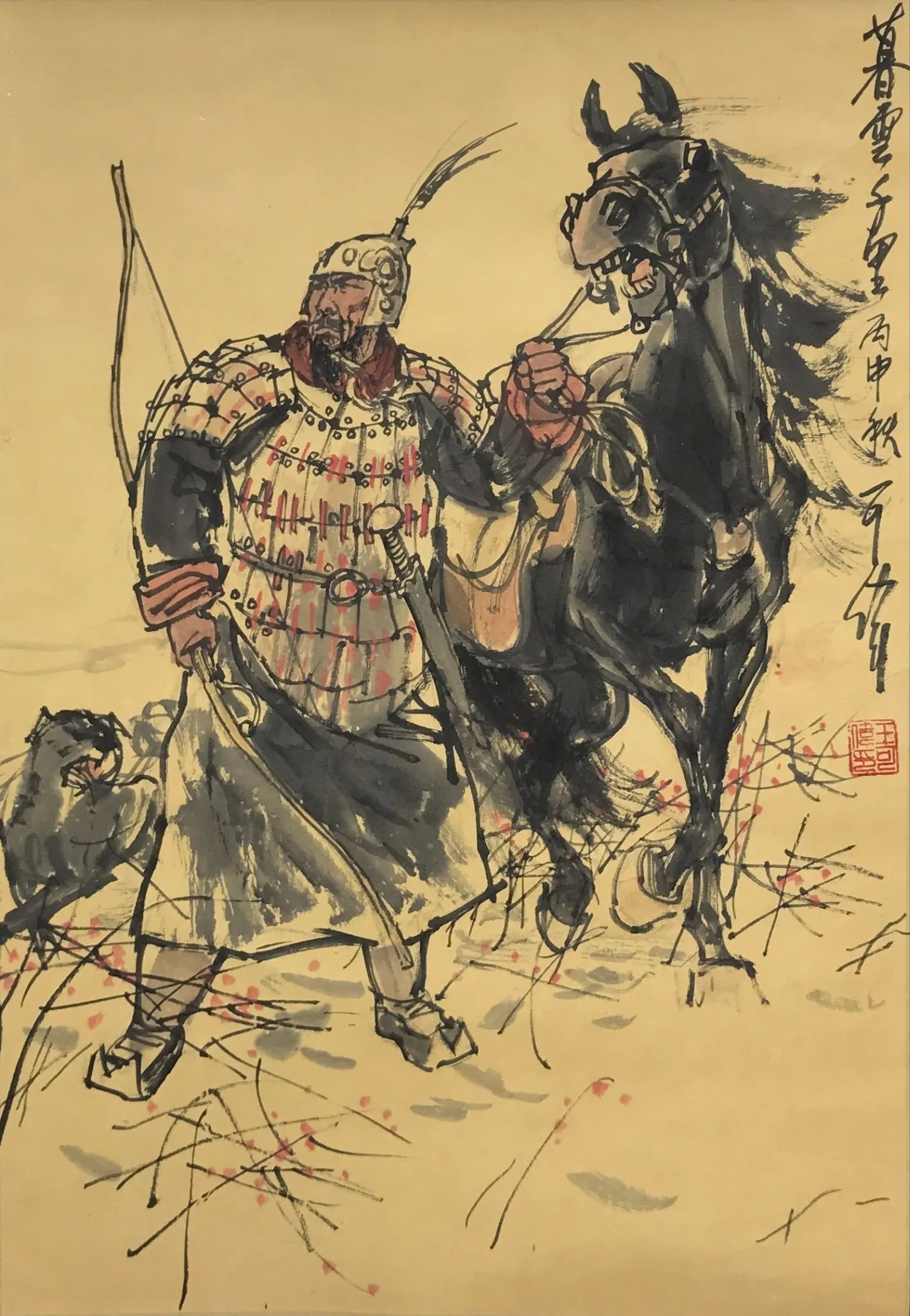 この水墨画は、写意の手法により、一人の将軍が馬を引いて歩く瞬間を表現しています。筆墨は粗放で力強く、馬は重墨と飛白によって強い動勢を生み出し、将軍は比較的抑えた線で描かれ、落ち着きと重厚な気質を表しています。長年戦場を経験してきた冷静さと統率力を体現し、動の中に静を含み、力強く雄渾な英雄的気息を呈しています。