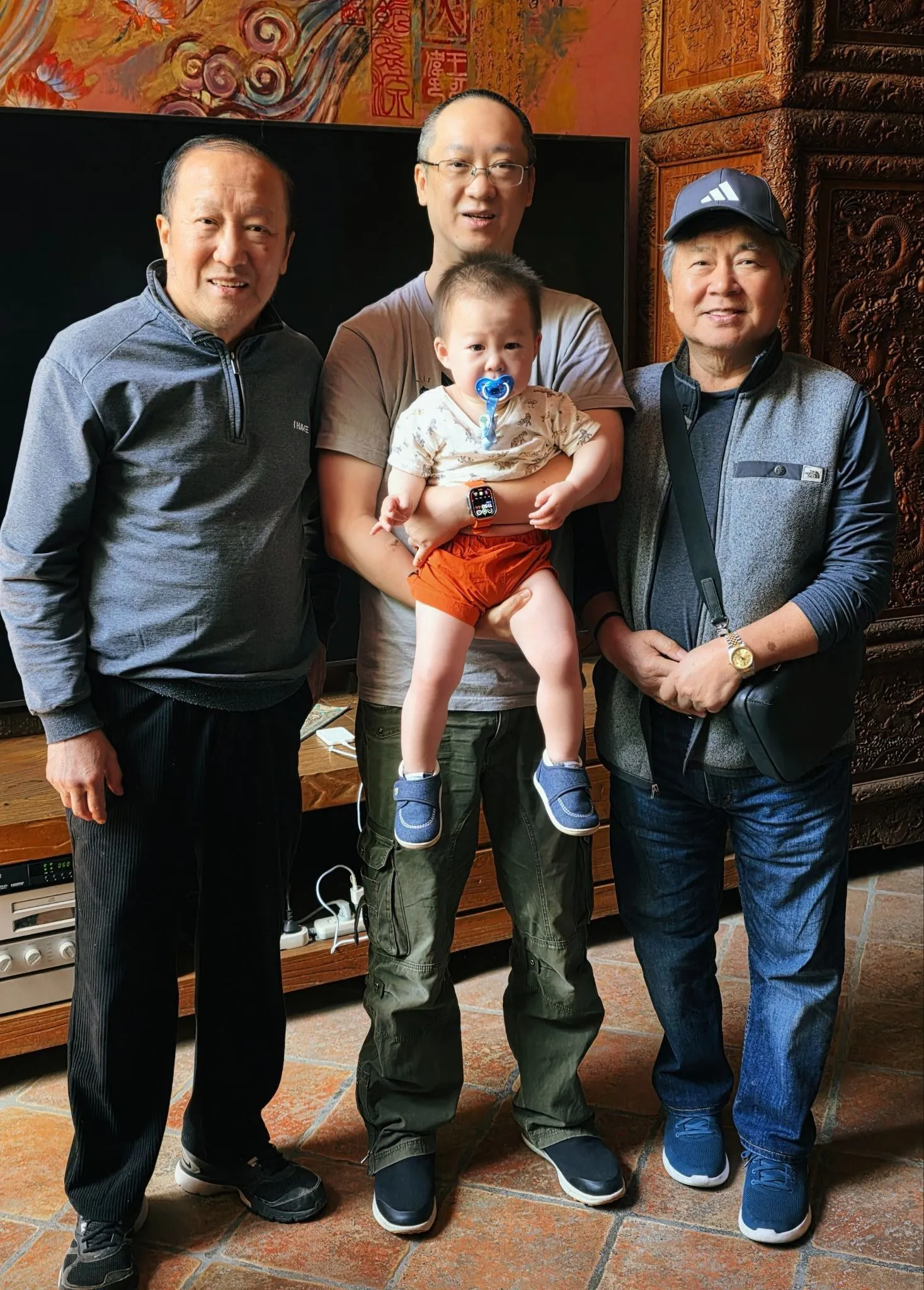 2025年5月、福岡から息子を連れて帰国し、父と再会したときの一枚。(左:父・王可伟 中央:年を重ねつつある私 右:アメリカ在住の従兄)