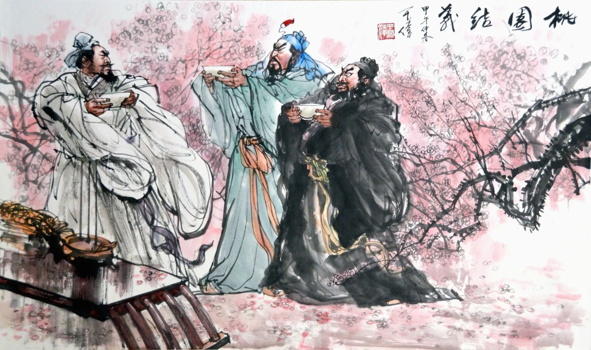 「桃園三結義」をテーマに創作されたこの水墨作品は、忠義・信念・理想という精神の核心を凝縮しています。画面は、刘备、关羽、张飞が乱世の中で志を同じくし、桃園において義兄弟の契りを結び、生死を共にすることを誓う場面を描いています。三人はその後、ともに戦い、動乱の中で理想と志を追い求めていく様子が表現されています。