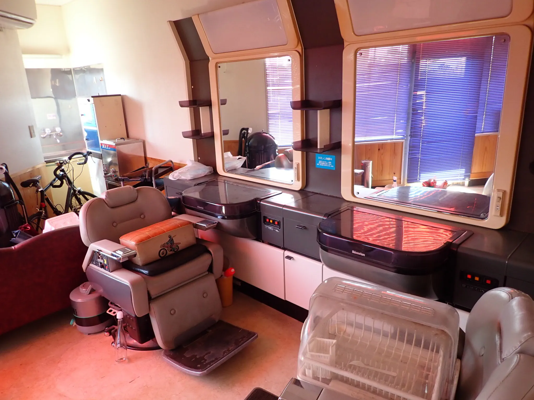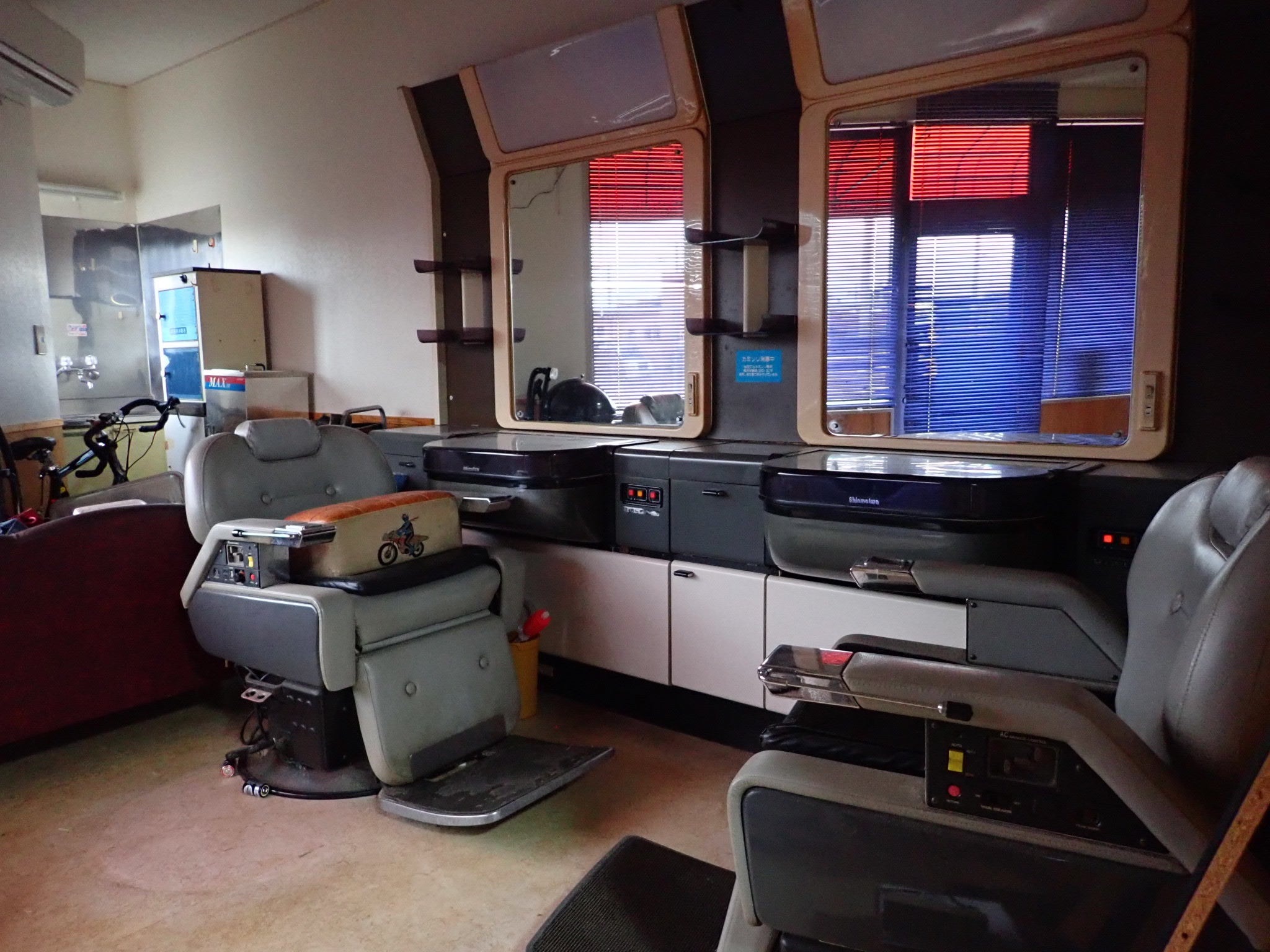 床屋さん時代のイスや鏡がそのままに。貰ってくれる方募集中です。この店舗部分はカウンター席を作り、自由に勉強や仕事ができたり、ちょっとしたイベントに使えるような、オープンスペースにしたいと考えています。