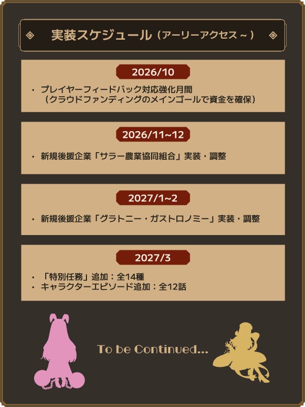 ストレッチゴールの達成状況やアーリーアクセスにお寄せいただいたフィードバック次第で大きく変更される可能性が高いです。