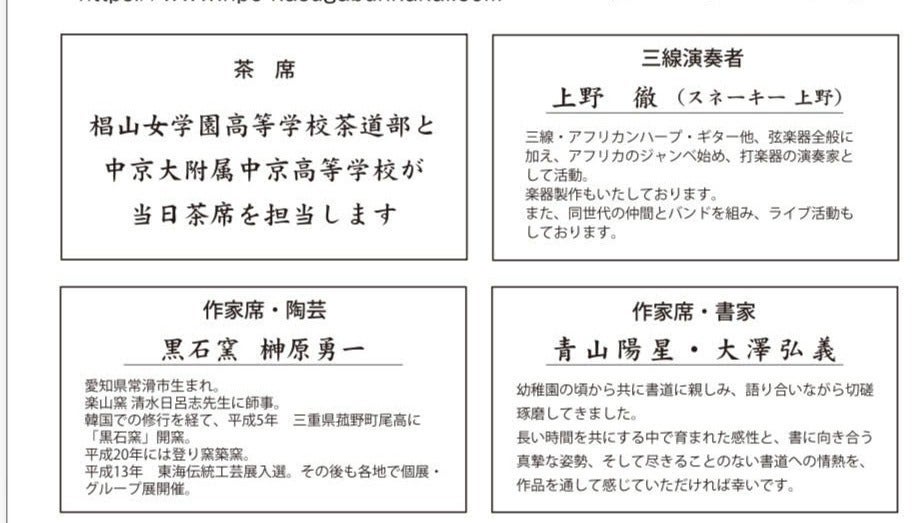併設とし陶芸席(黒石窯 榊原勇一)・書家席(青山陽星 大澤弘義)・三線演奏(上野 徹)