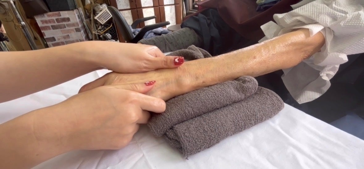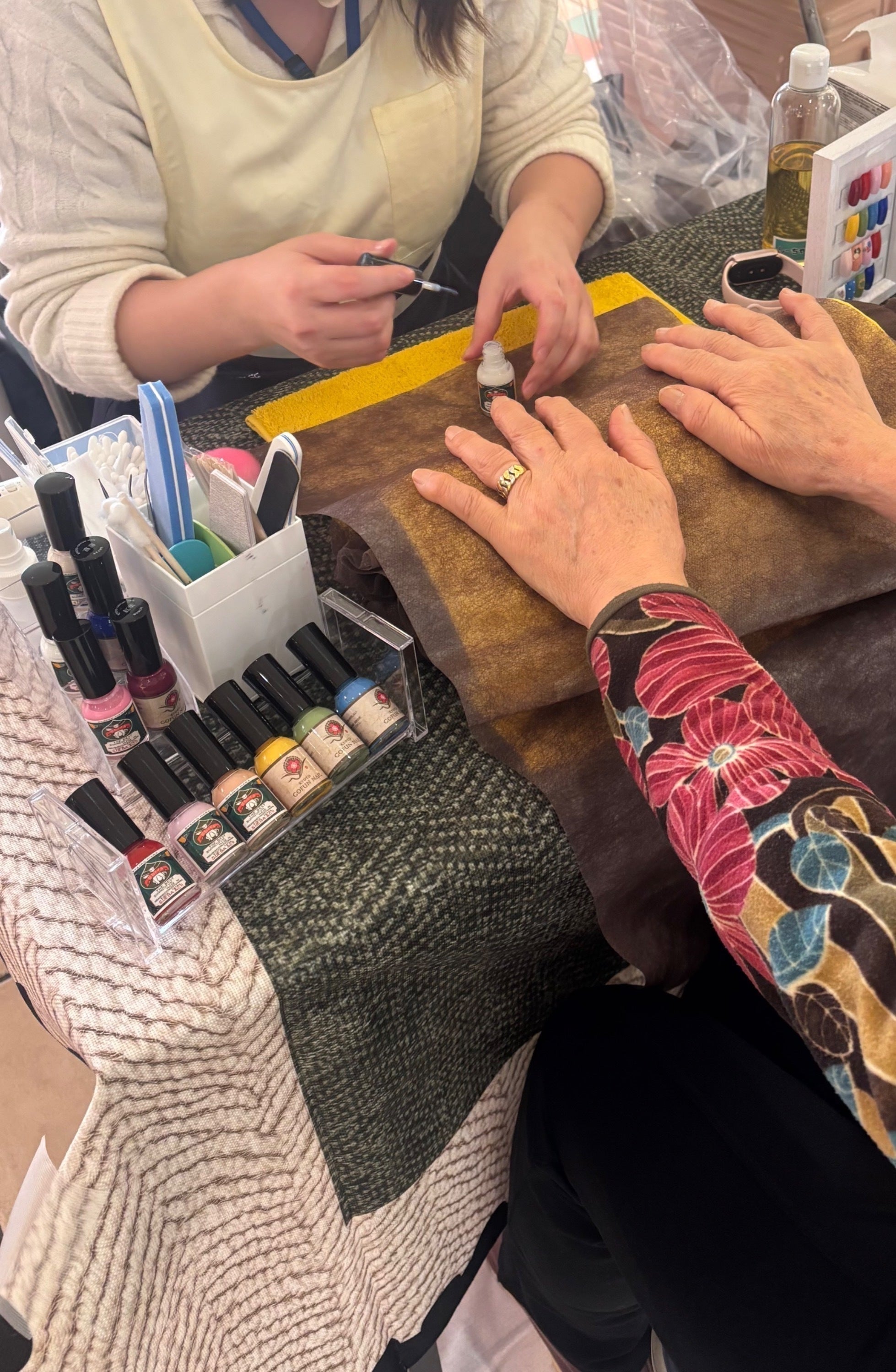 例えば、エステで使用するオイルは保湿力の高いものを選定し、乾燥しやすい高齢者の肌をしっかりケアします。ネイルは刺激臭のない、速乾性で水溶性の落としやすいものを使用し、体への負担を最小限に抑えています。
