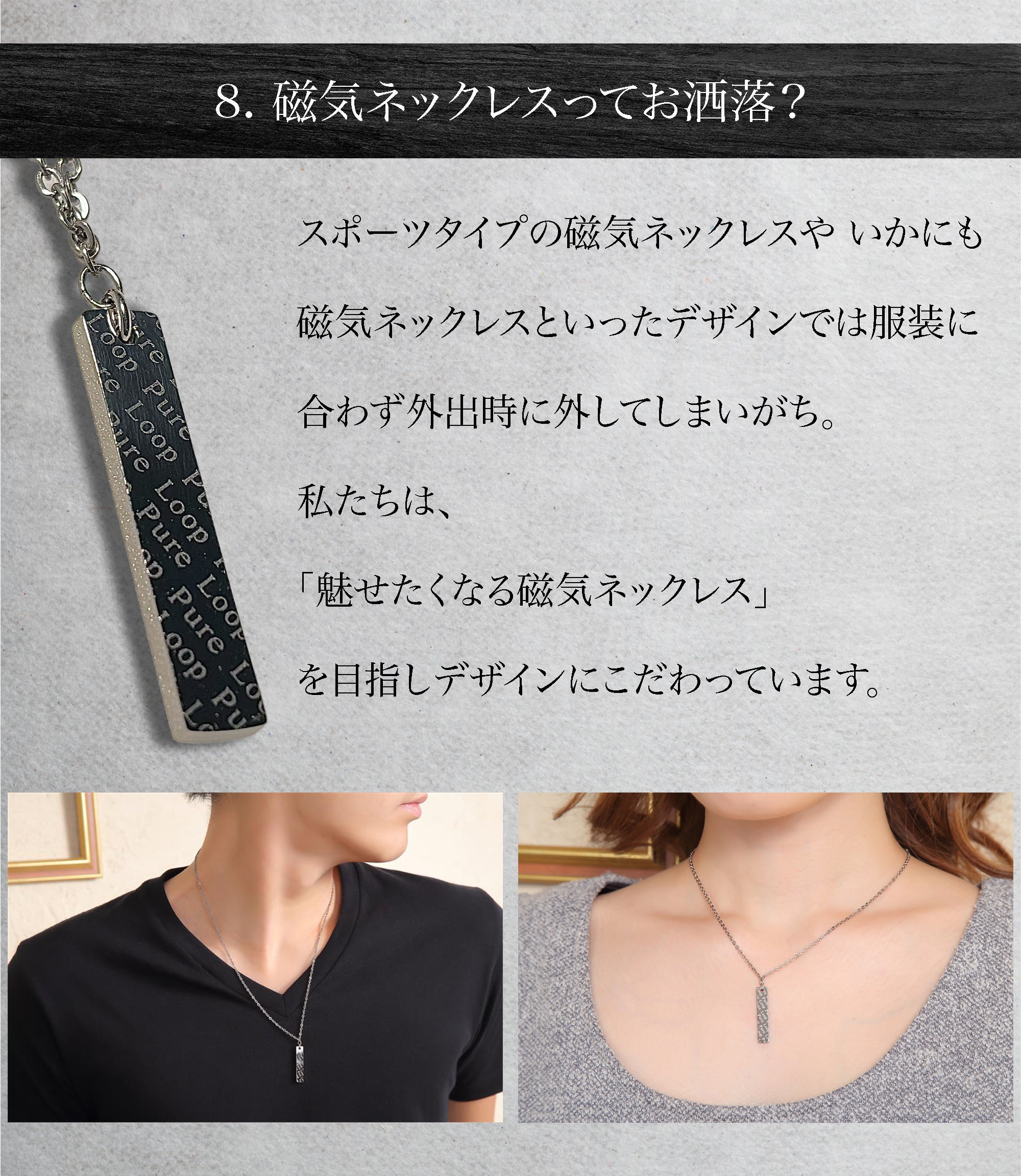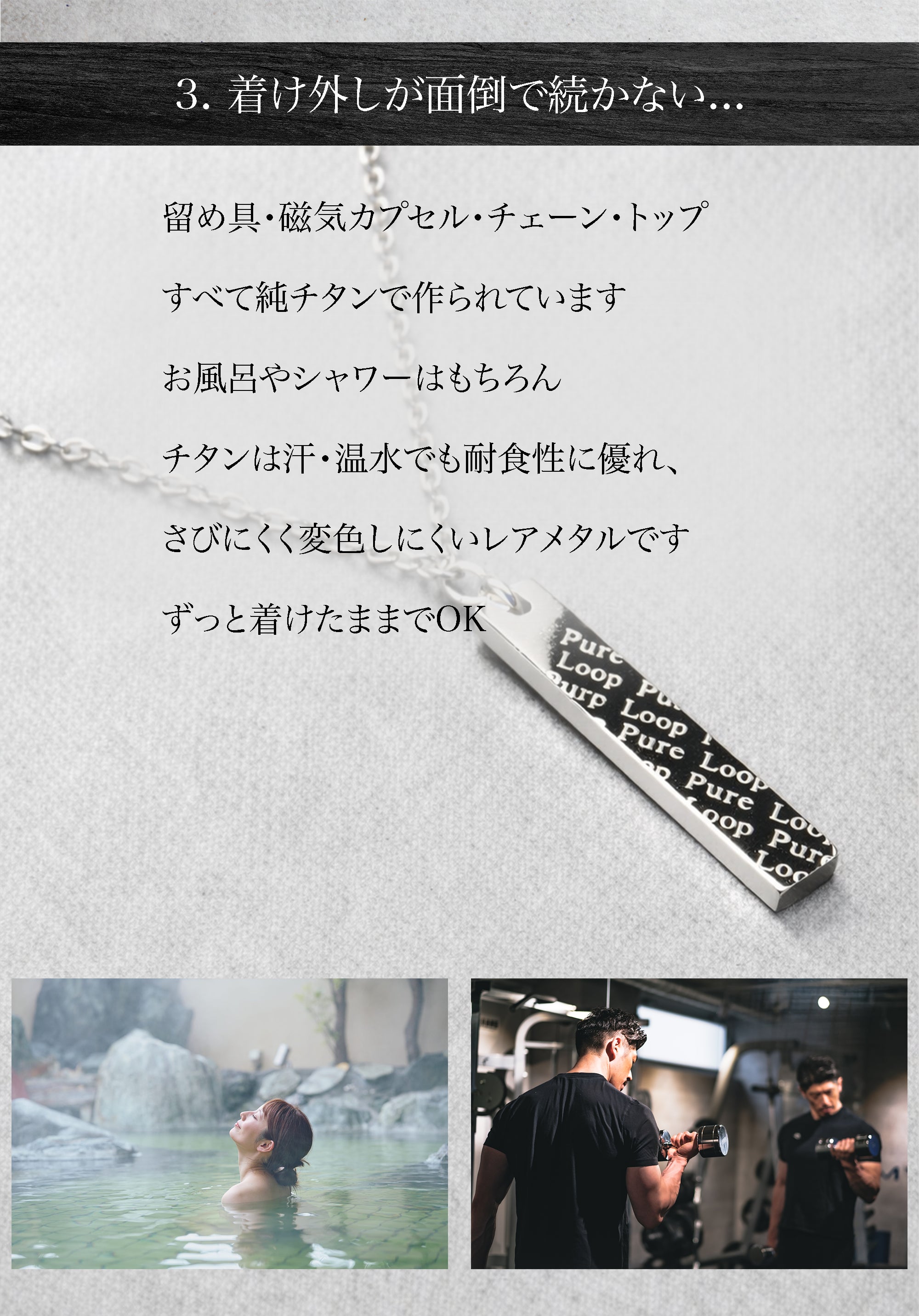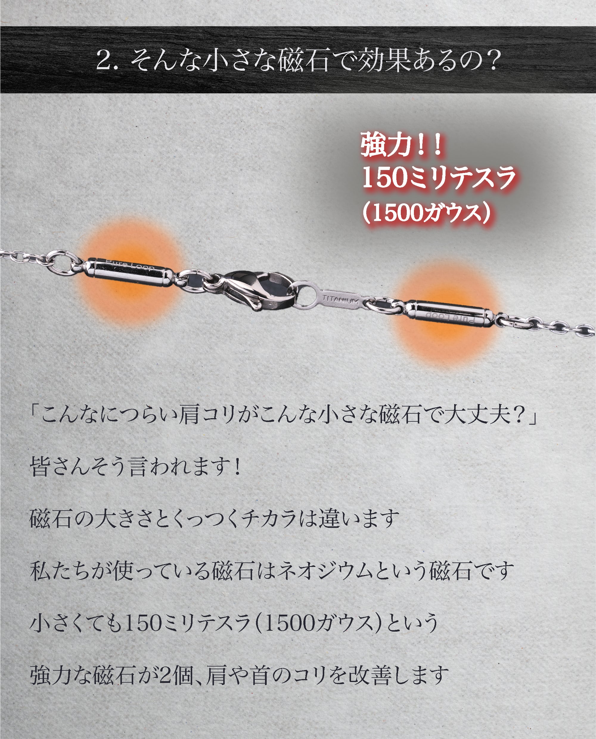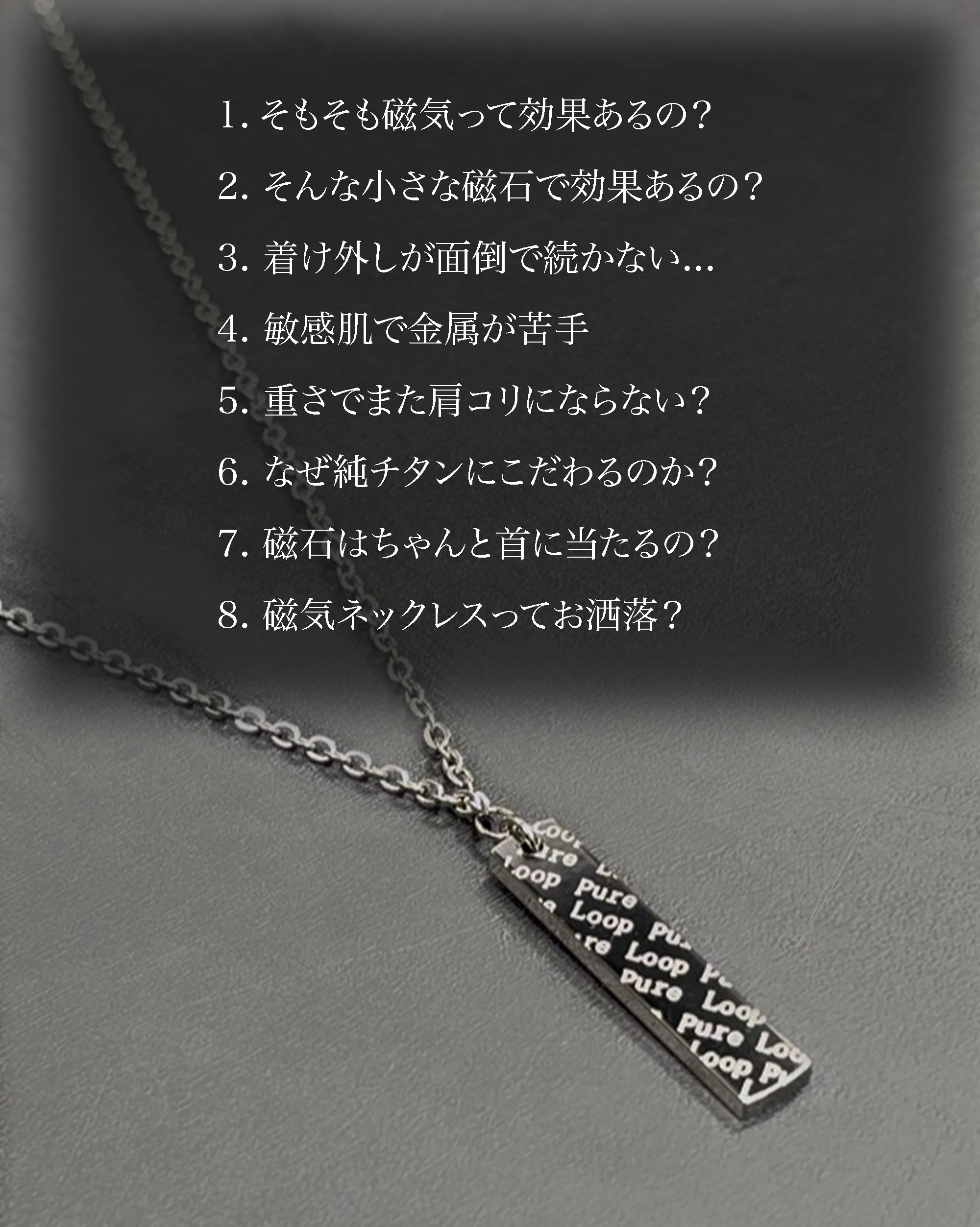 東大阪の町工場が60年近い経験と技術で作り上げた管理医療機器の純チタン永久磁気ネックレス。磁気ネックレスを使ったことがない方にも磁気ネックレスの効果を実感していただきたいという思いでPURE LOOP史上最低価格で作り上げました。おしゃれを楽しみながら、肩・首のコリ、血行改善をサポートします。