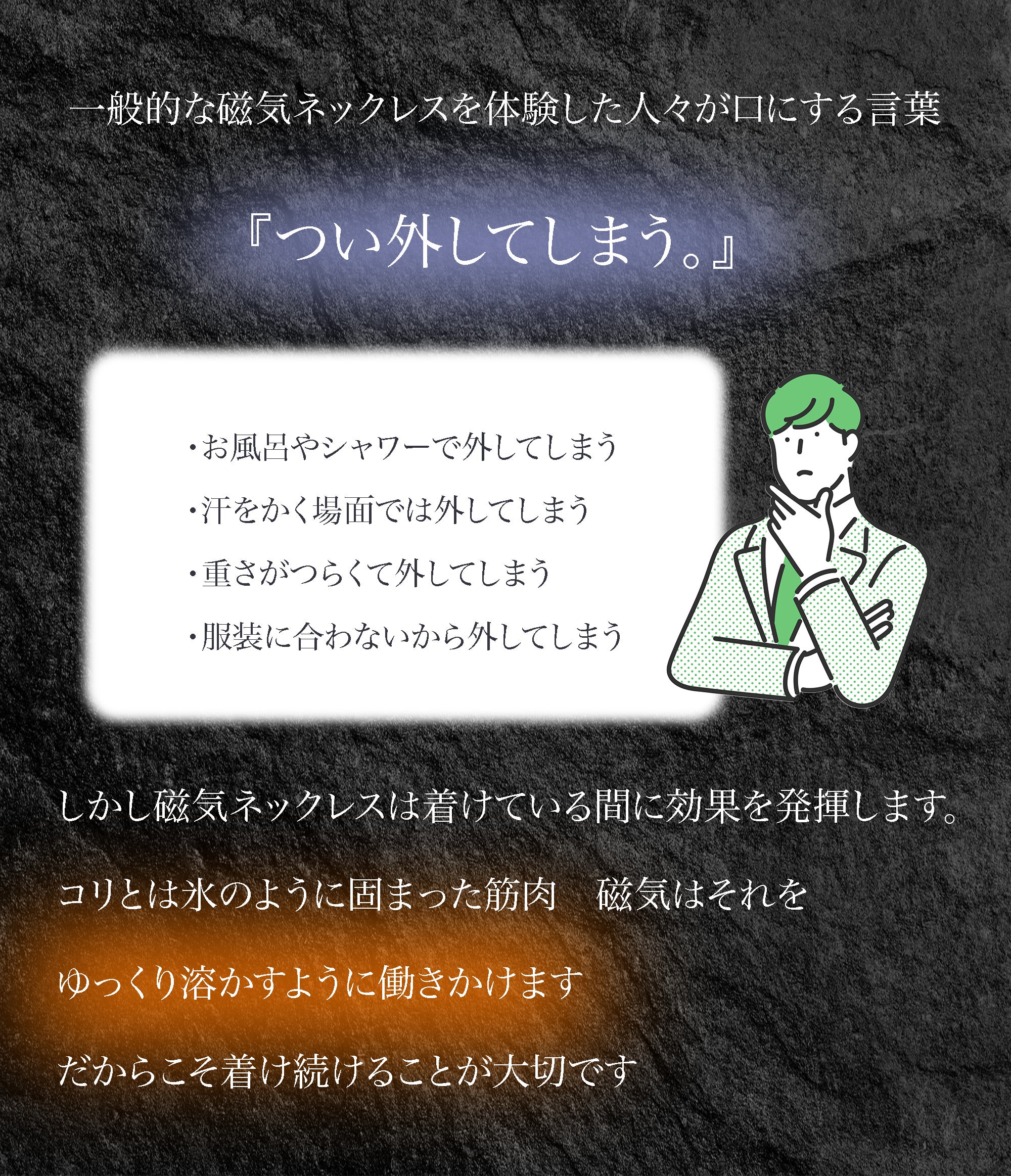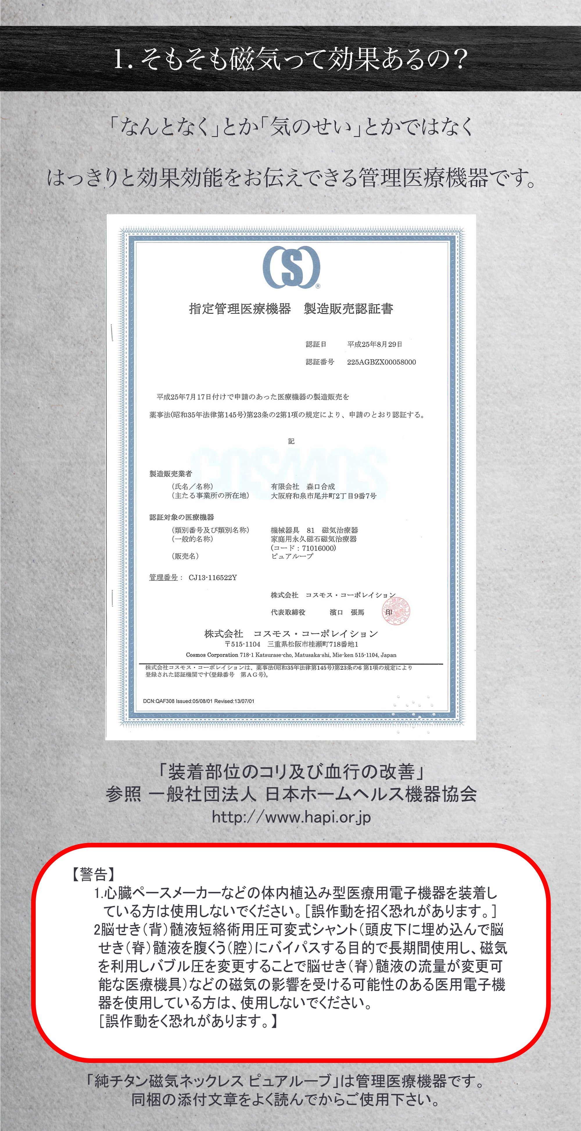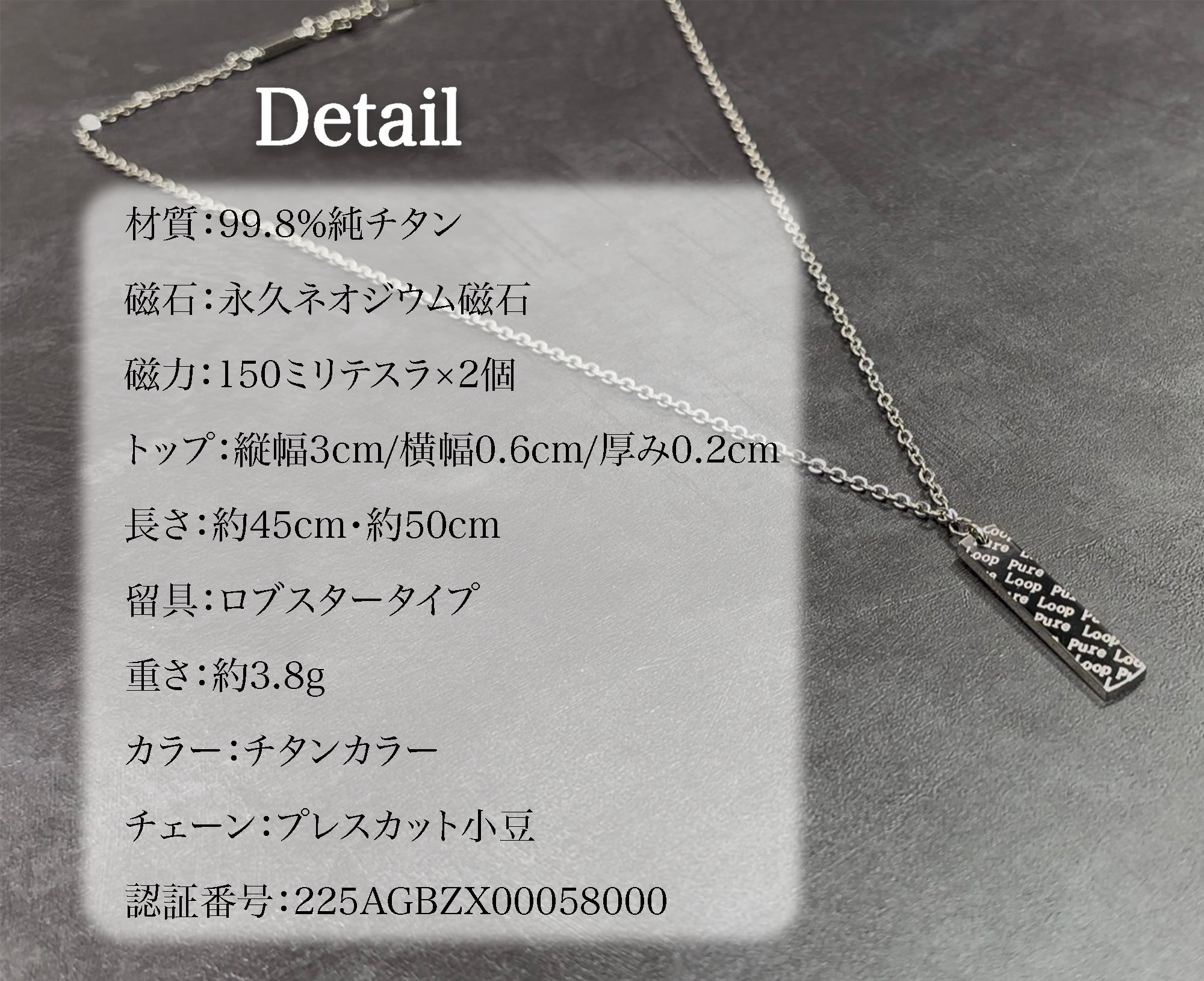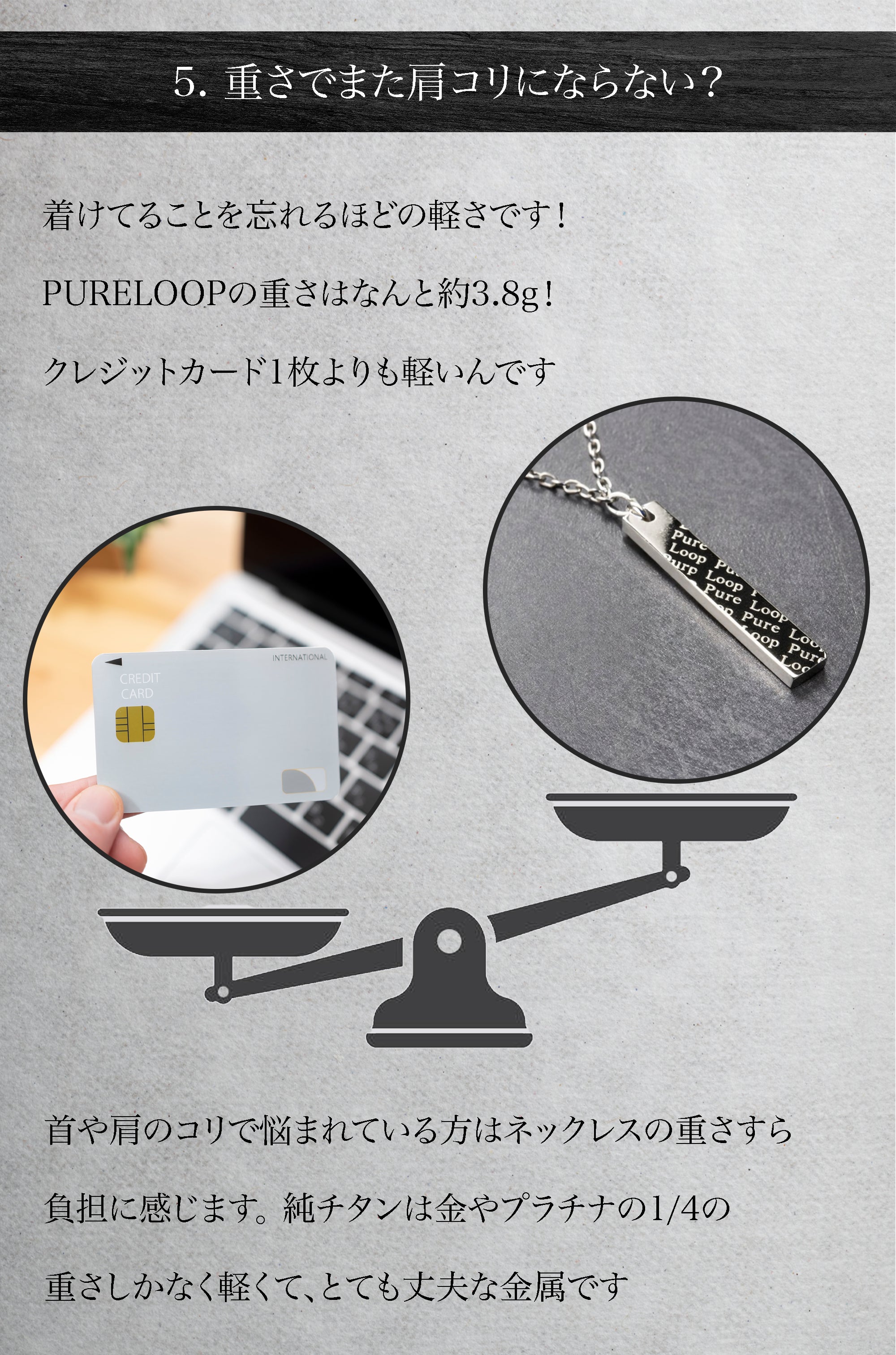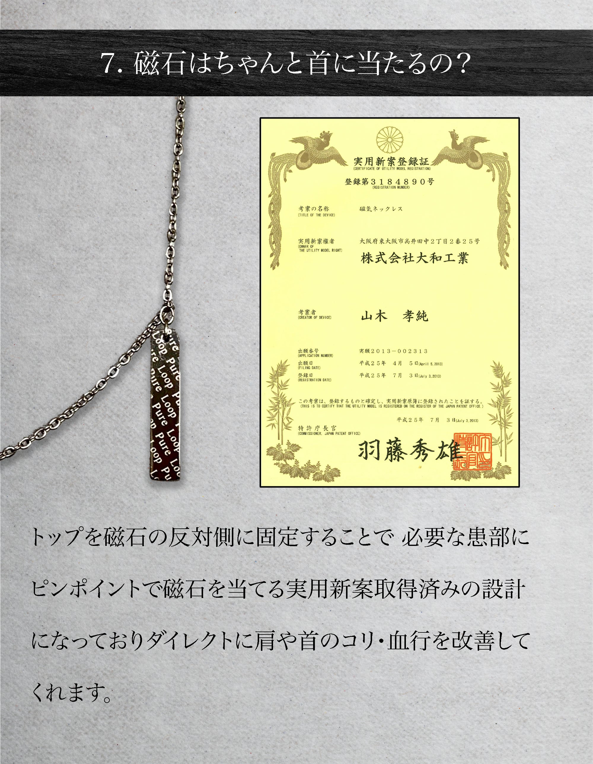 東大阪の町工場が60年近い経験と技術で作り上げた管理医療機器の純チタン永久磁気ネックレス。磁気ネックレスを使ったことがない方にも磁気ネックレスの効果を実感していただきたいという思いでPURE LOOP史上最低価格で作り上げました。おしゃれを楽しみながら、肩・首のコリ、血行改善をサポートします。