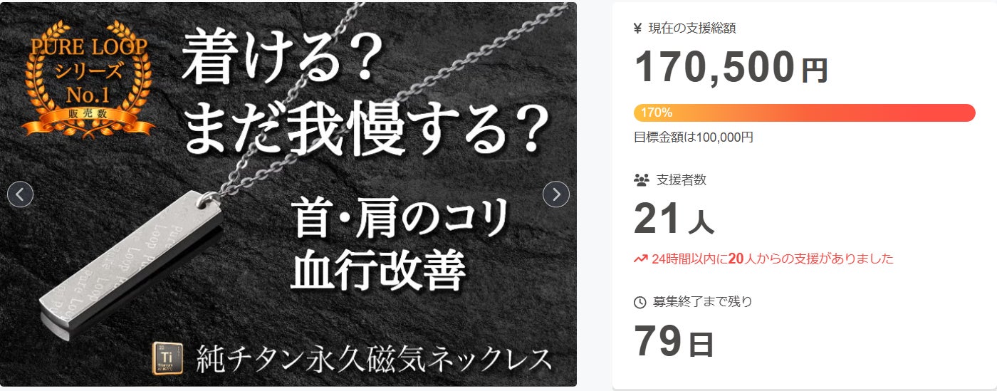 • サポーターの皆様お世話になります。純チタン磁気ネックレスPURE LOOP OZよりプレートタイプのプロジェクトが公開されわずか5分足らずで目標の金額を達成しました!サポーターの皆様のご支援のおかげで目標を達成することができ大変嬉しく思っております。この度のプレートタイプは純チタン磁気ネックレスの効果効能を気軽に体感してもらうためにシリーズの中でお求めやすい価格設定となっております。一度、効果効能を体感してみてください。周りに肩や首のコリでお悩みの方などいらっしゃいましたらお声かけ頂けると助かります。始まったばかりですが、全力で取り組んでまいりますので宜しくお願い致します。 もっと見る
