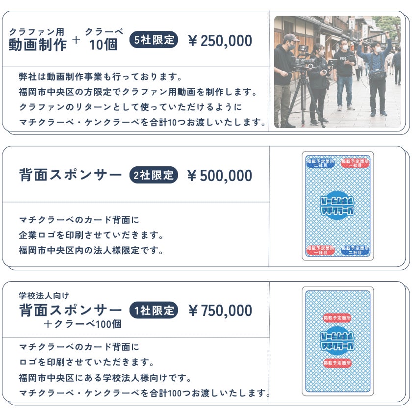※クラファン掲載用動画制作はインタビュー形式2~3名や商品撮影、福岡市内にて撮影を想定。その他地域の場合の交通費やモデル等のキャスティングが発生した場合は別途ご負担いただきます。制作の有効期限は、クラウドファンディング成功後3か月とさせていだきます。