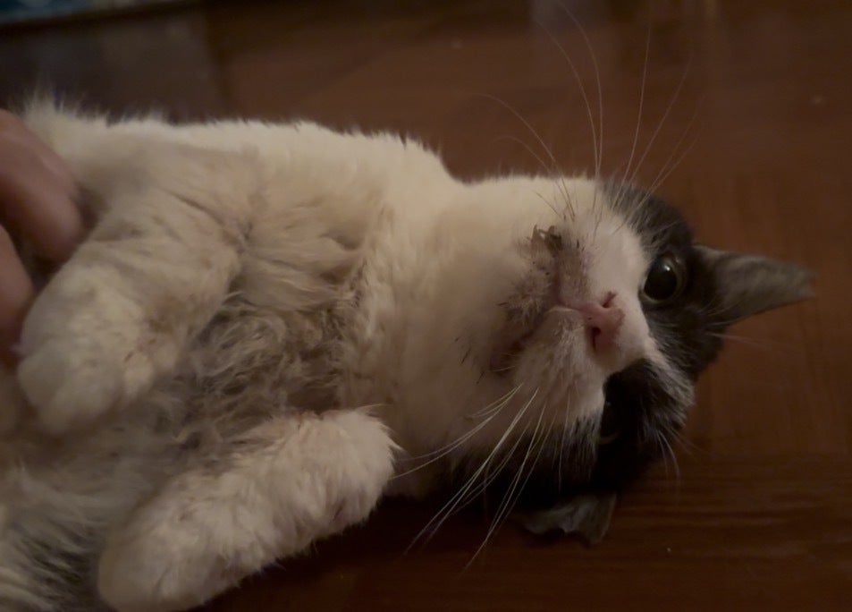 背中などは真っ白でとても綺麗な毛並みなので、口腔内の異常が治ればきっと、全身つやつやになるだろうなと期待しています。