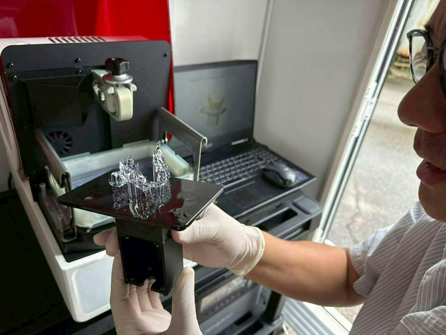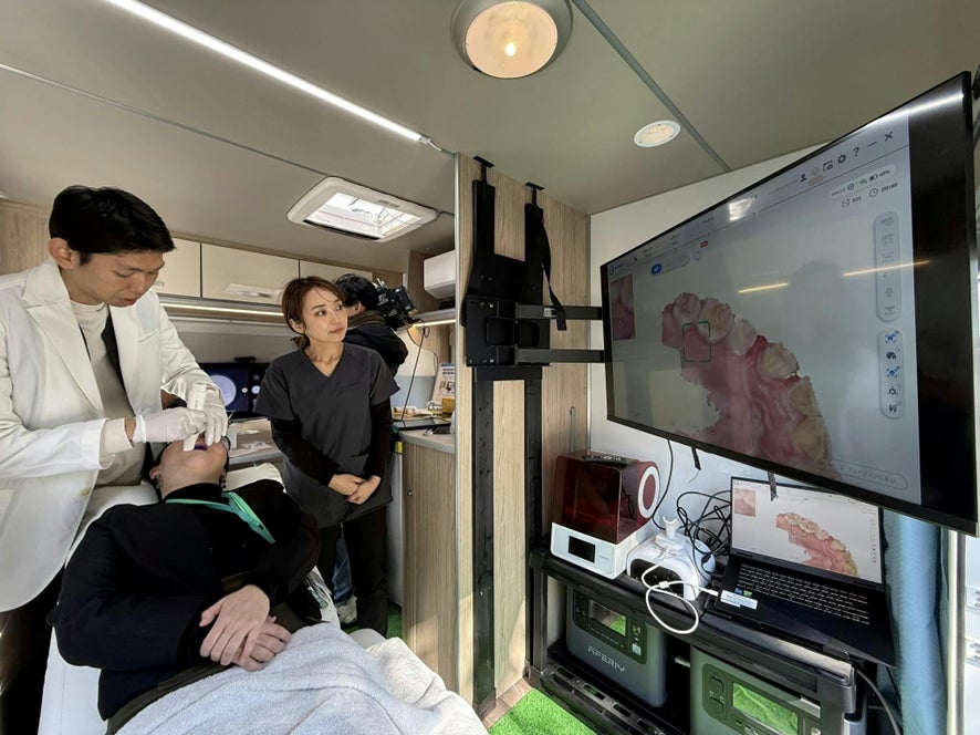 見慣れた自分の店の前まで、ゆっくり歩いてきてもらう。車内で口腔内をスキャンし、データは遠隔で歯科技工へ。その場で3Dプリンタが動き始める。