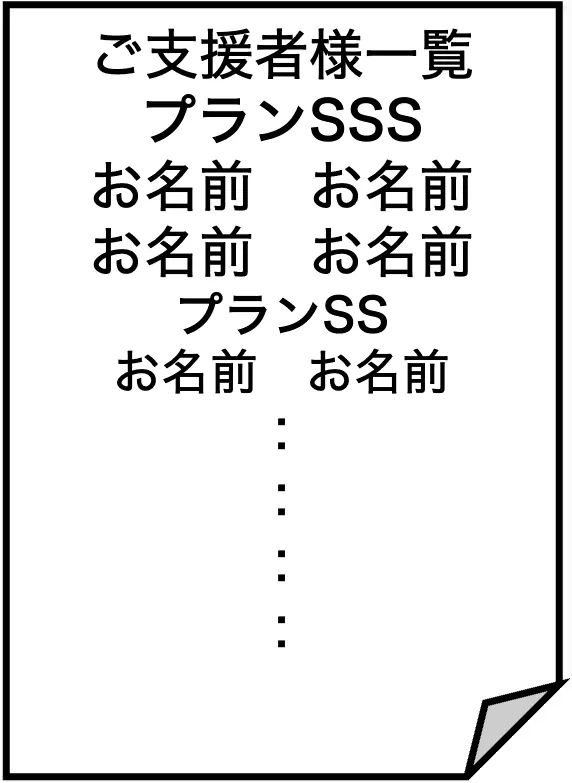 支援いただいた皆様のお名前をWebサイトに掲載、および物理媒体の発送がある方にはお名前一覧をリターン品としてお送りします。
