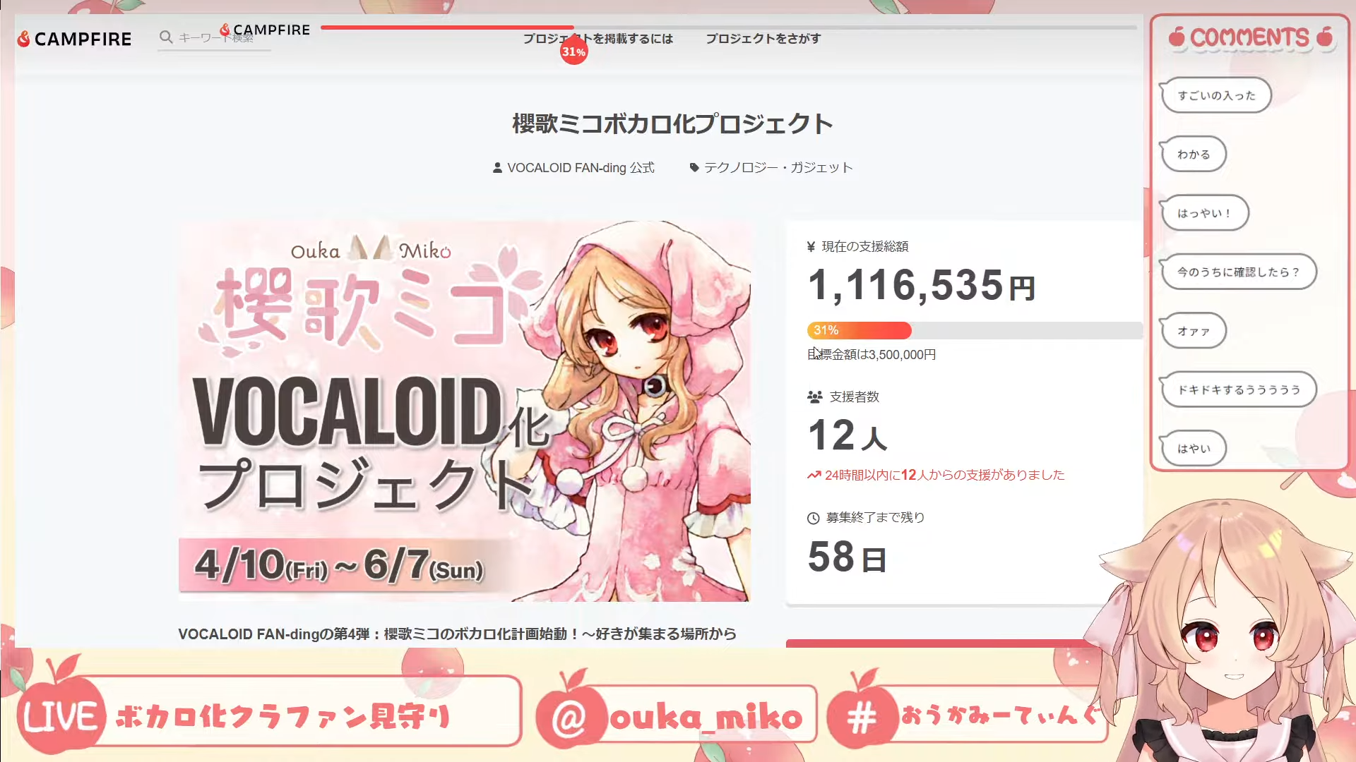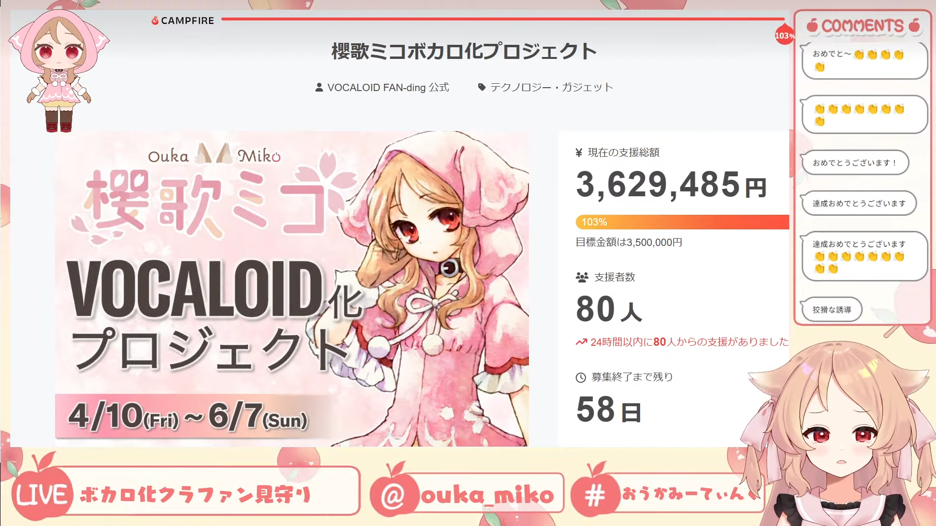 クラファン初日での達成ということで、櫻歌実恋さまによる見守り配信中での達成でした。