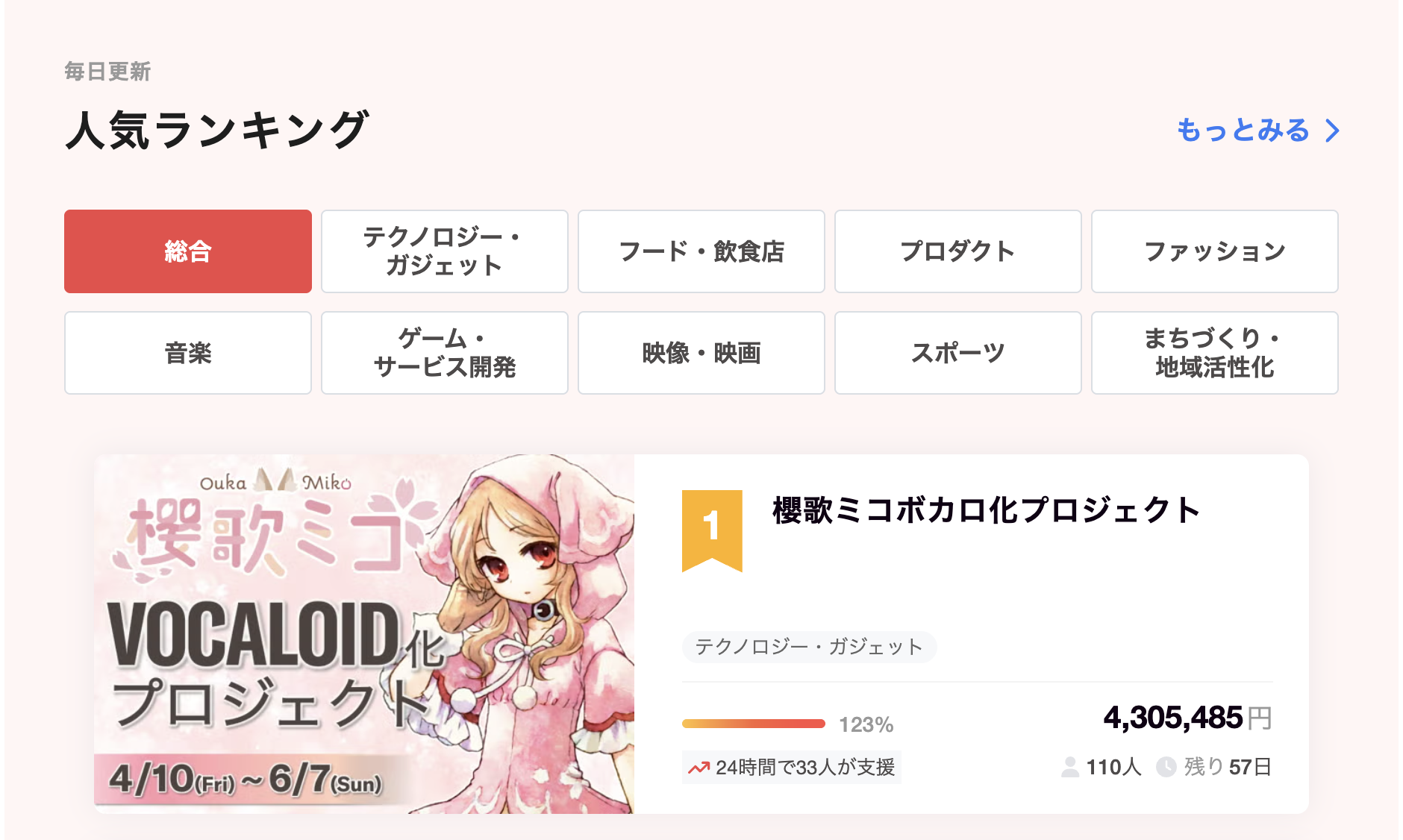 開始翌日となる4月11日には、支援額も400万円を超え、CAMPFIREの人気ランキング総合1位を獲得するなど、快進撃を続けております。