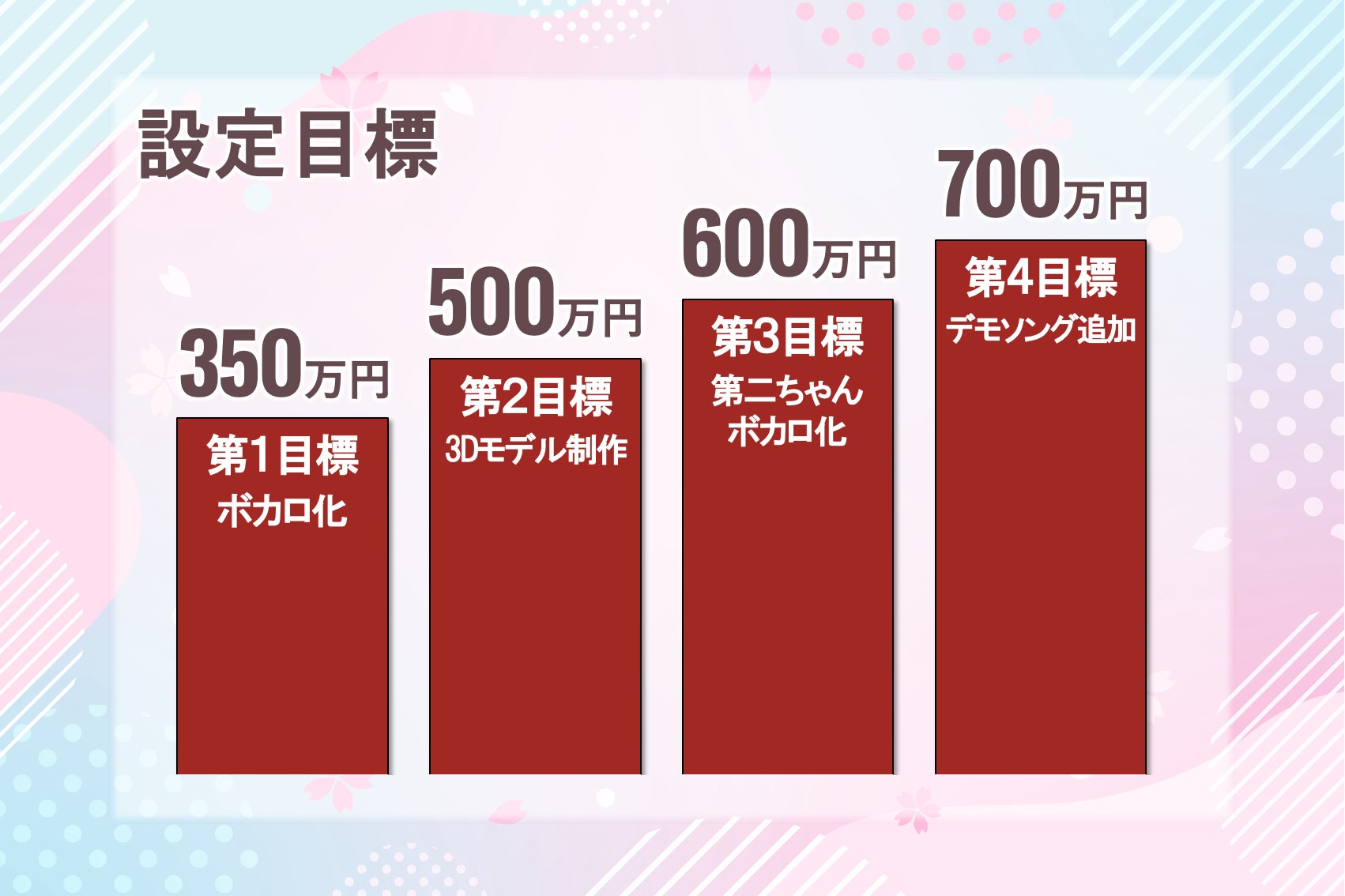 そして、ストレッチゴールとして、第2目標の3Dモデル制作を始め、第3目標には第二ちゃんのボカロ化を設定させていただいております。