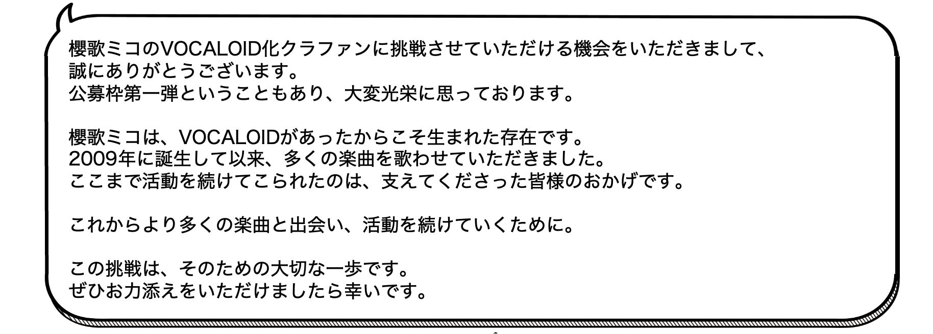 そして、櫻歌ミコ様には公募枠で選ばれた最初の挑戦者として、ボカロ化に挑戦いただきたいと考えております。