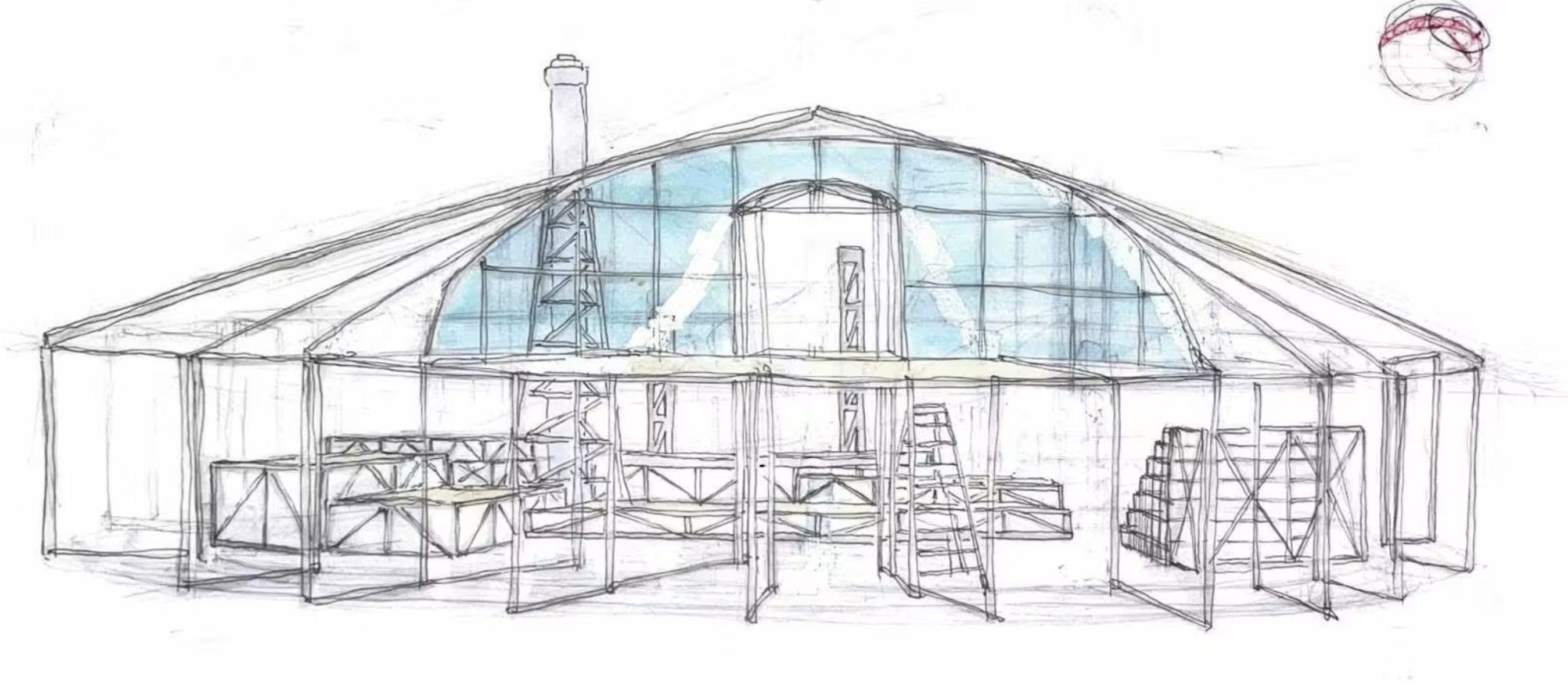 合計325本、総延長は東京タワー約2本分に及ぶ単管パイプでできた直径17mの巨大テント劇場です。
