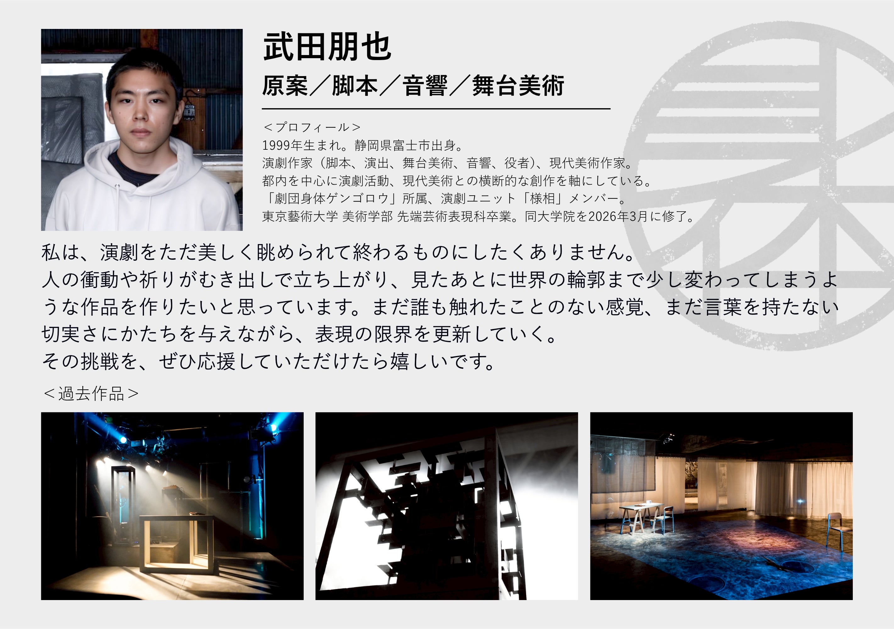 小劇場を拠点に約7年間活動を続け、2026年3月に東京藝大を卒業しました。