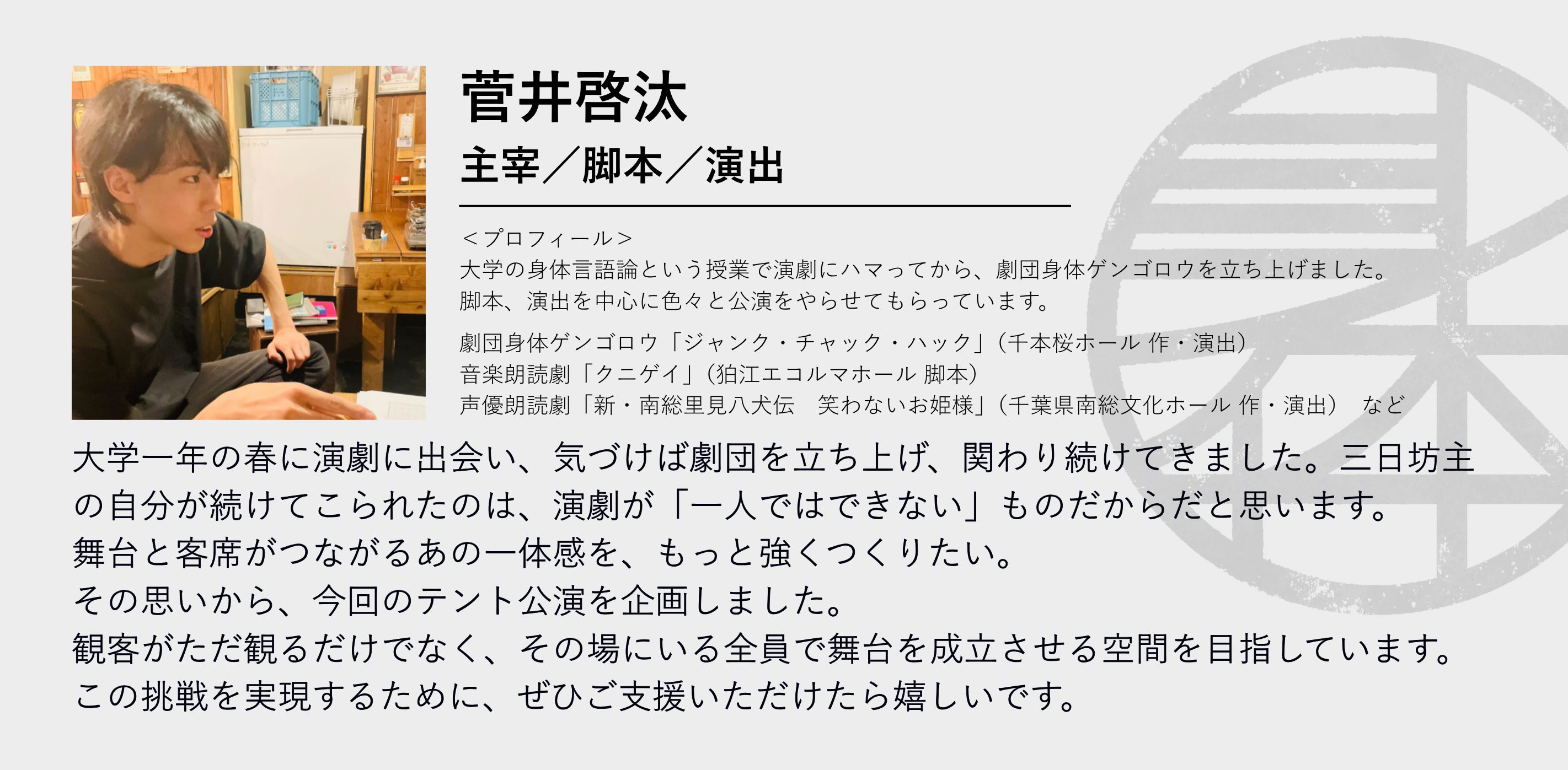 ぜひこの「身・テント演劇」をご支援いただけますと幸いです。