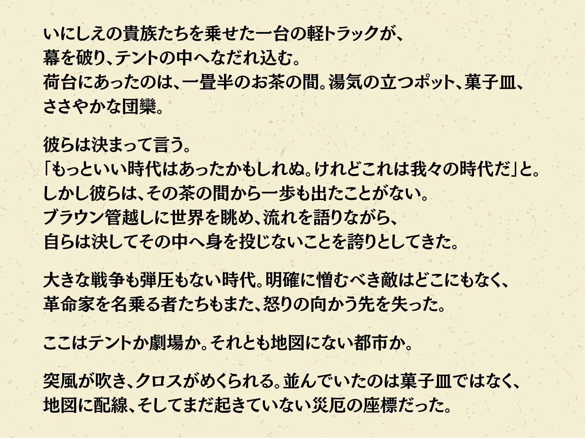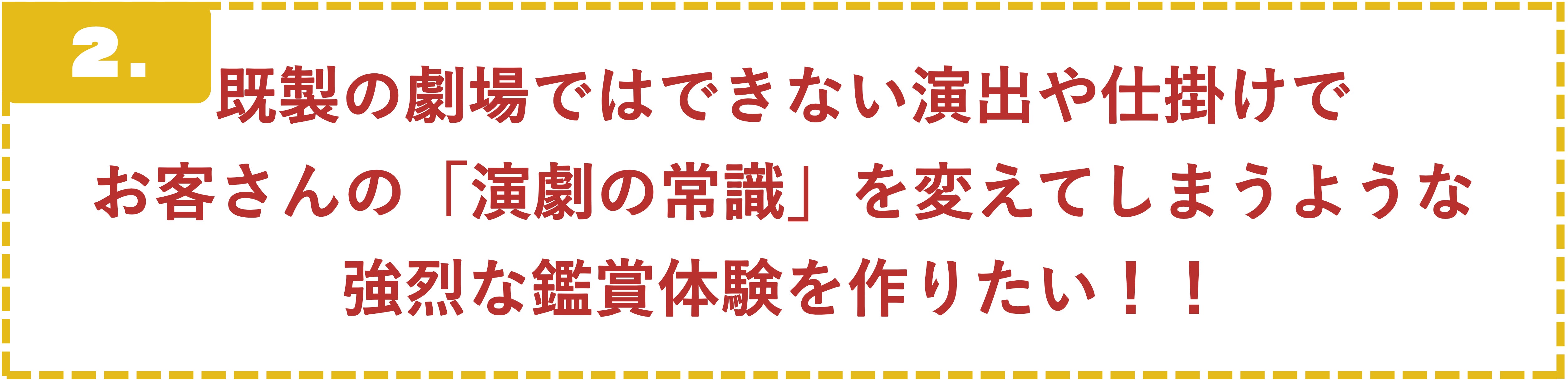 既製の劇場では絶対にできない演劇を、なんでもデジタルの時代だからこそもっと手触りと熱のある体験を、なぜかその場にいる全員が一体となってしまう祭りのような空間を、私たちの手で作り上げたいと思っています。