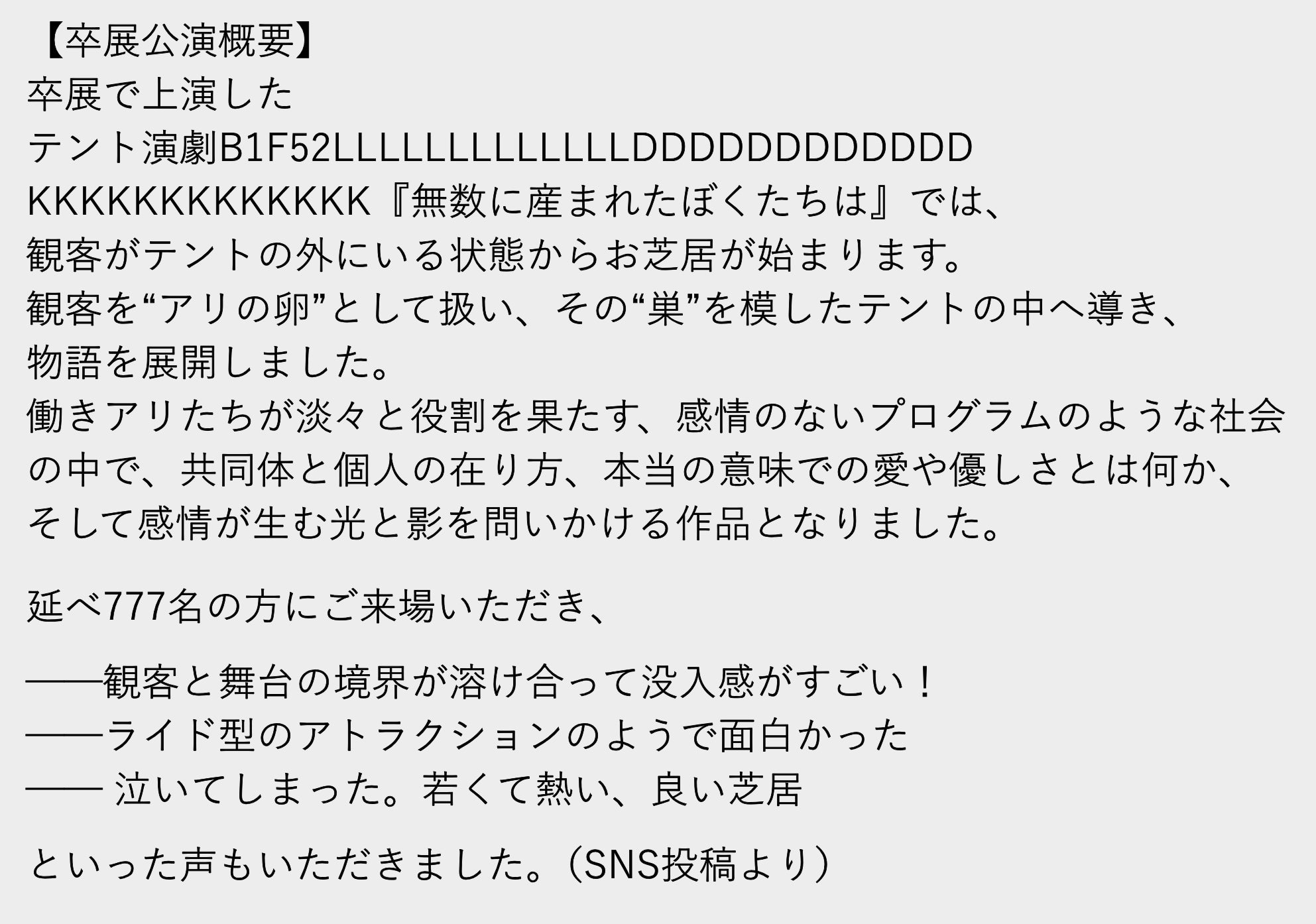 「演劇ってこんなに自由で、こんなに面白かったんだ」と一人でも多くの方に思っていただき、演劇の可能性を感じていただけたら本望です。