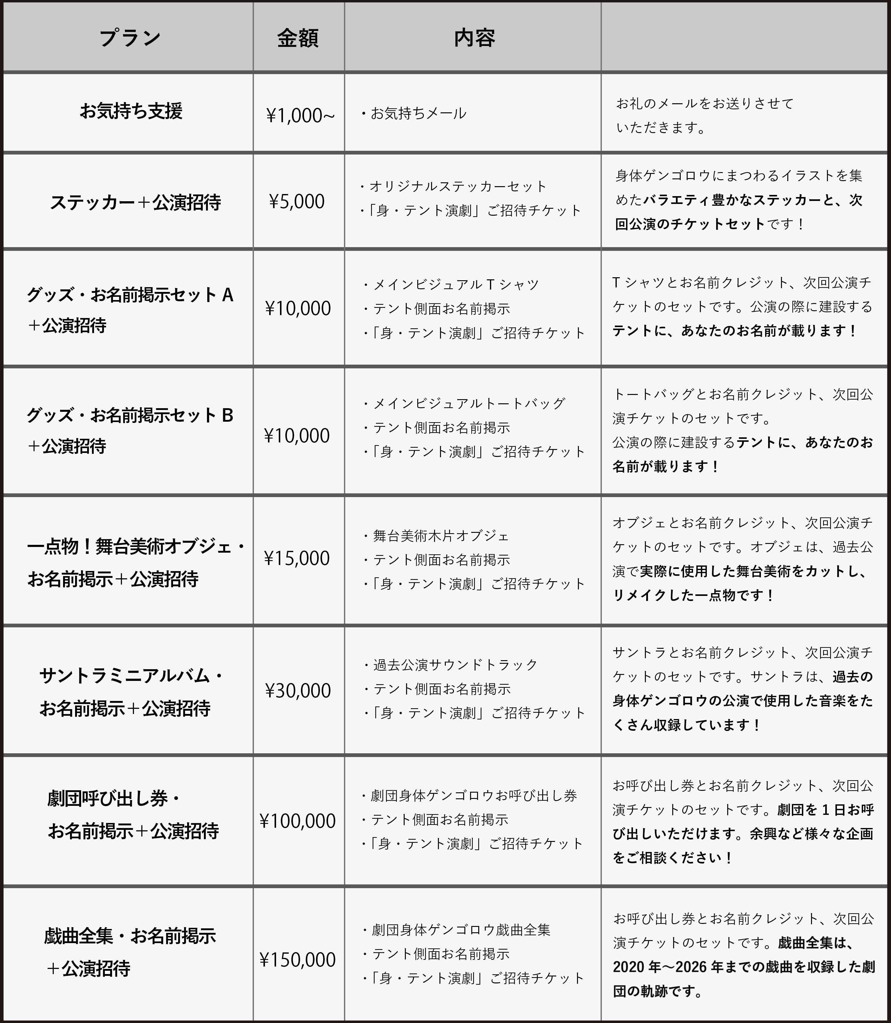 リターン品として、テント演劇へのご招待オリジナルグッズ、劇団身体ゲンゴロウのこれまでの公演に関わるものなど、私たちだからこそお返しできるものもご用意させていただきました。