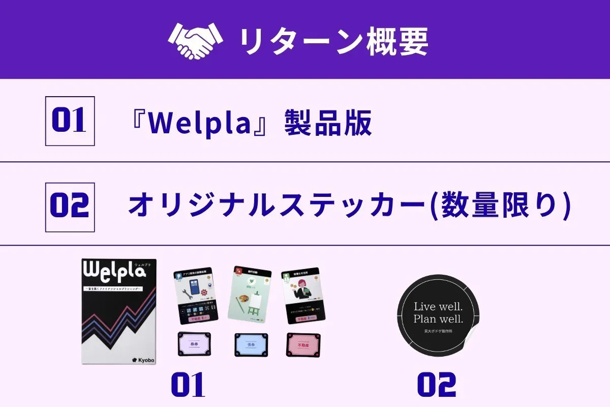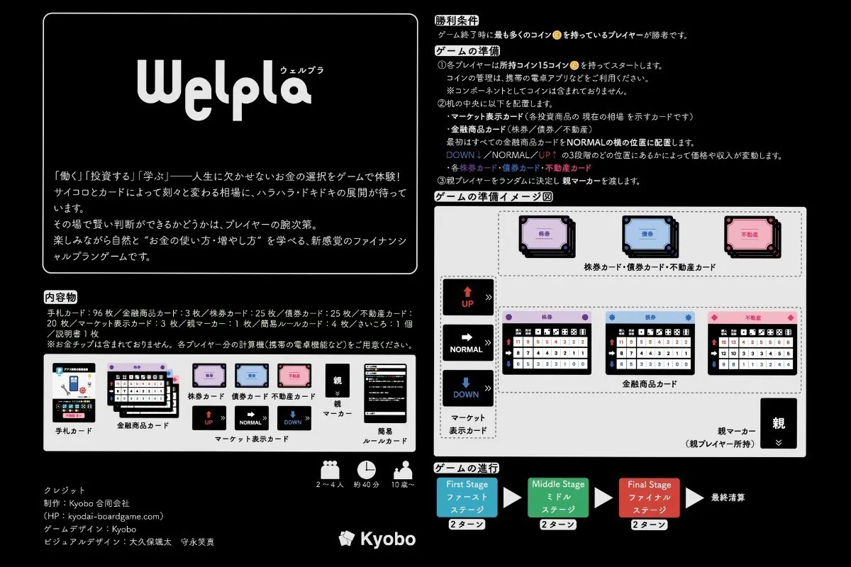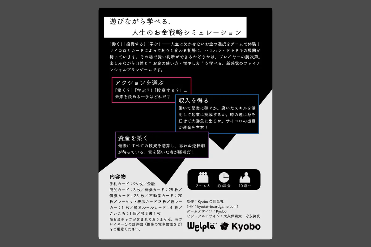 『Welpla』は、「学ぶ」「働く」「貯める」「投資する」といったファイナンシャルプランニング(FP)をゲームで体験できる、2〜4人用のファイナンスカードゲームです。