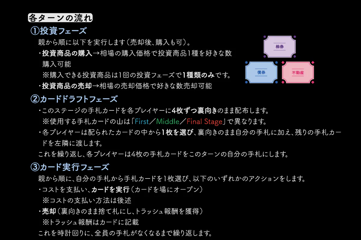 ・購入:相場の購入価格で投資商品を購入。(ただし1回の投資フェーズで購入できるのは1種類のみ)