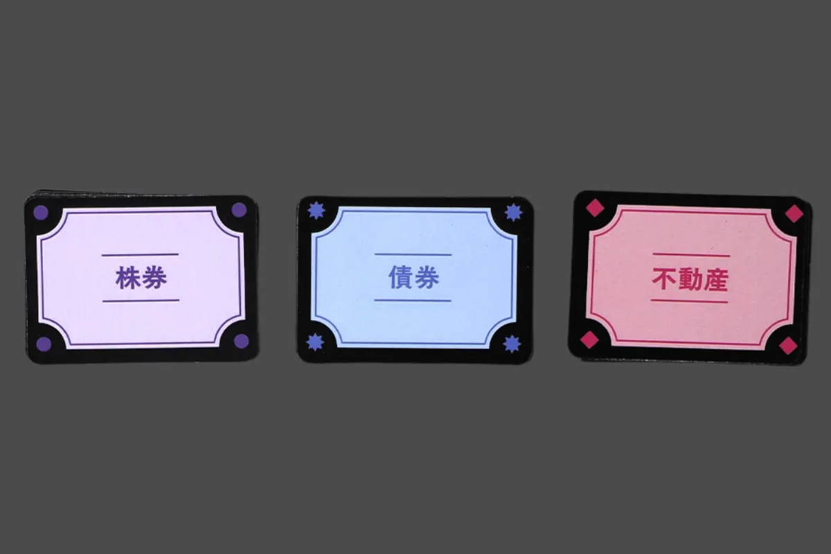 投資先は 株券・債券・不動産 の3種類。それぞれに DOWN / NORMAL / UP の3段階の相場があり、ターンごとにプレイヤーが出したカードの効果で変動します。