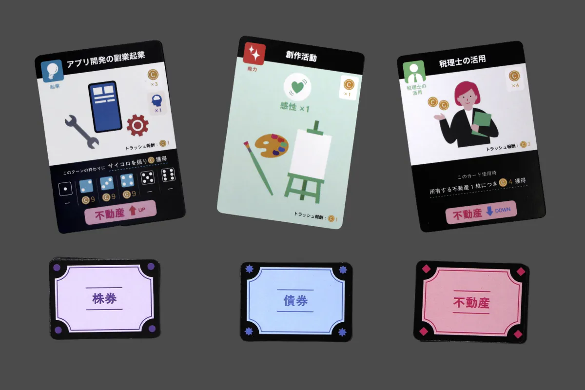 プレイヤーは勉強や仕事、起業などのアクションと株式・不動産・債券の3種類の金融商品の売買を駆使して、資産を増やしていきます。