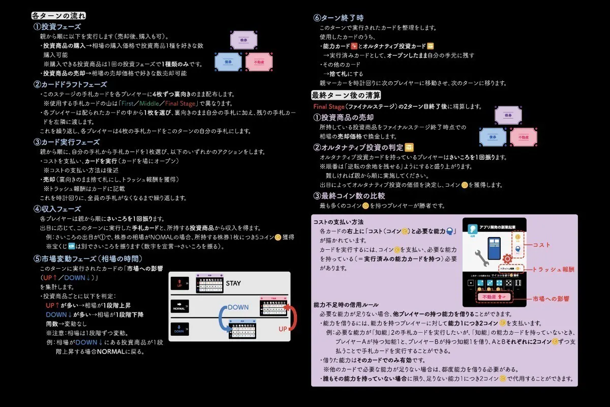 各ステージで使えるカードの山が異なり、ゲームが進むにつれて手札のパワーも相場の振れ幅も大きくなります。序盤は地道に能力を育て、中盤で投資に打って出て、終盤の精算で一気に差がつく。