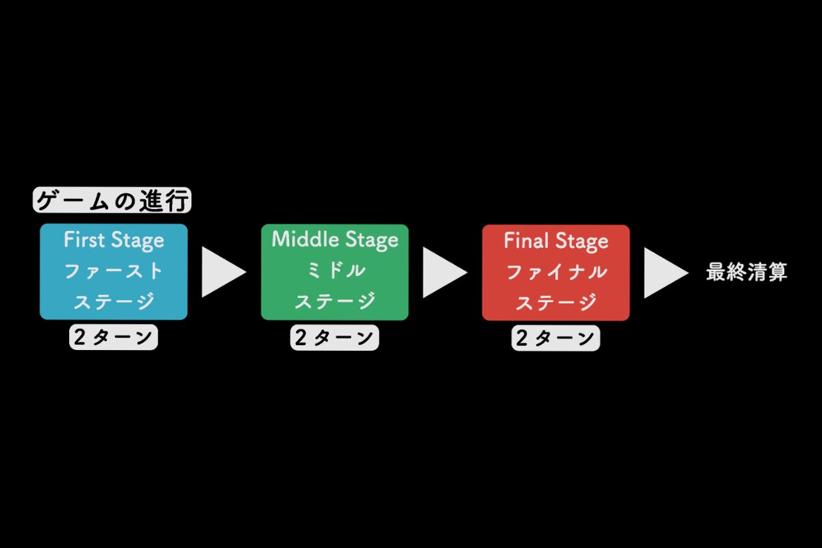 ゲームは First Stage → Middle Stage → Final Stage の3ステージ、全6ターンで構成されています。