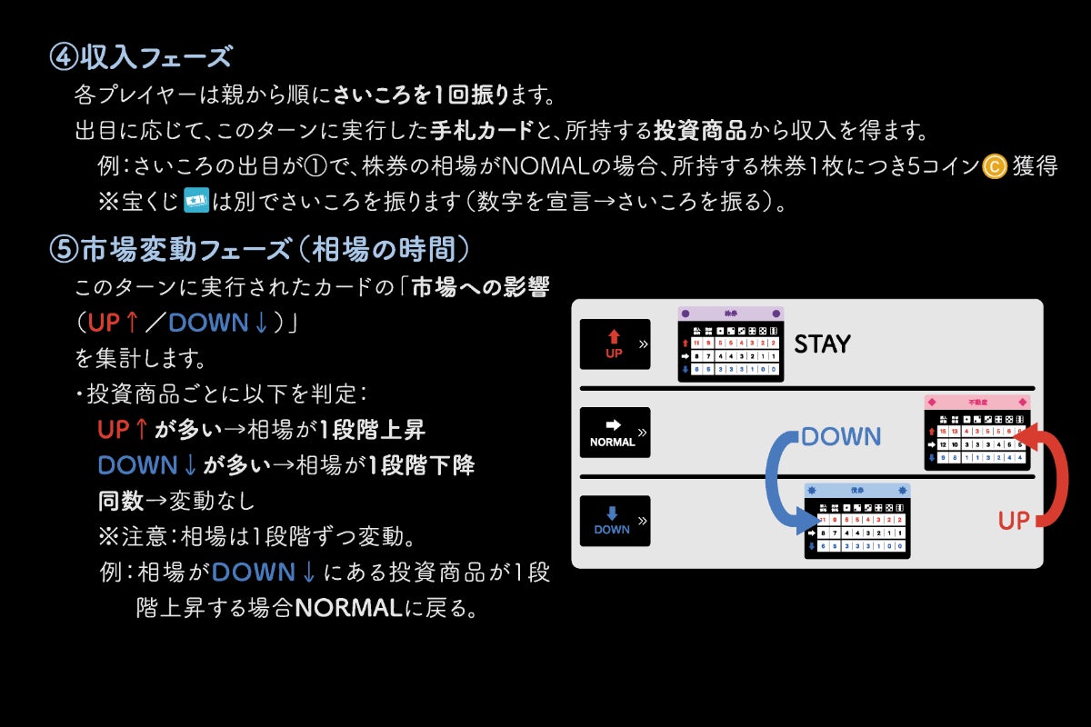 投資先は 株券・債券・不動産 の3種類。それぞれに DOWN / NORMAL / UP の3段階の相場があり、ターンごとにプレイヤーが出したカードの効果で変動します。