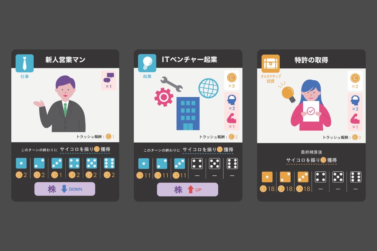 プレイヤーは勉強や仕事、起業などのアクションと株式・不動産・債券の3種類の金融商品の売買を駆使して、資産を増やしていきます。