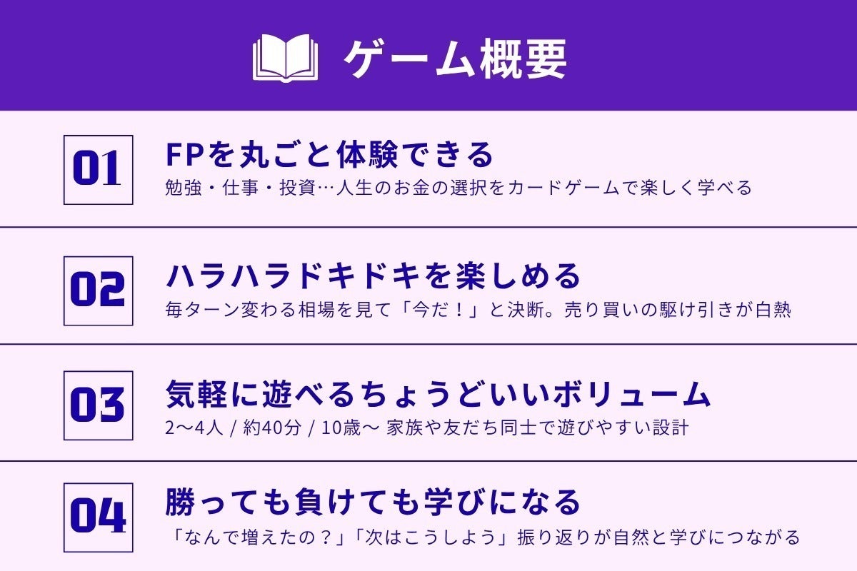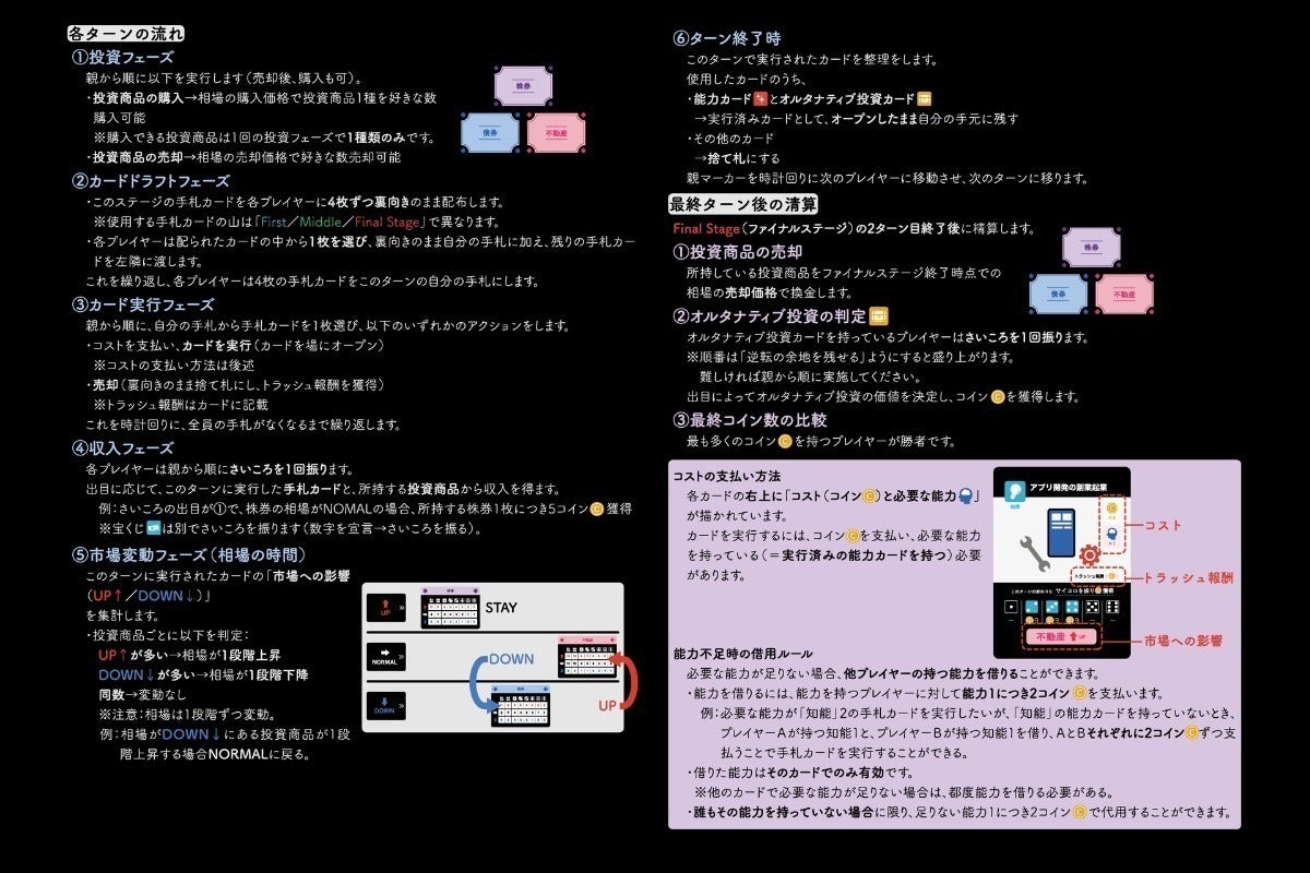 判断によって変わる相場に、プレイヤーの知恵と判断力が試されます。楽しみながら自然と、お金の稼ぎ方・増やし方・守り方を学べる、新感覚のファイナンスゲームです。