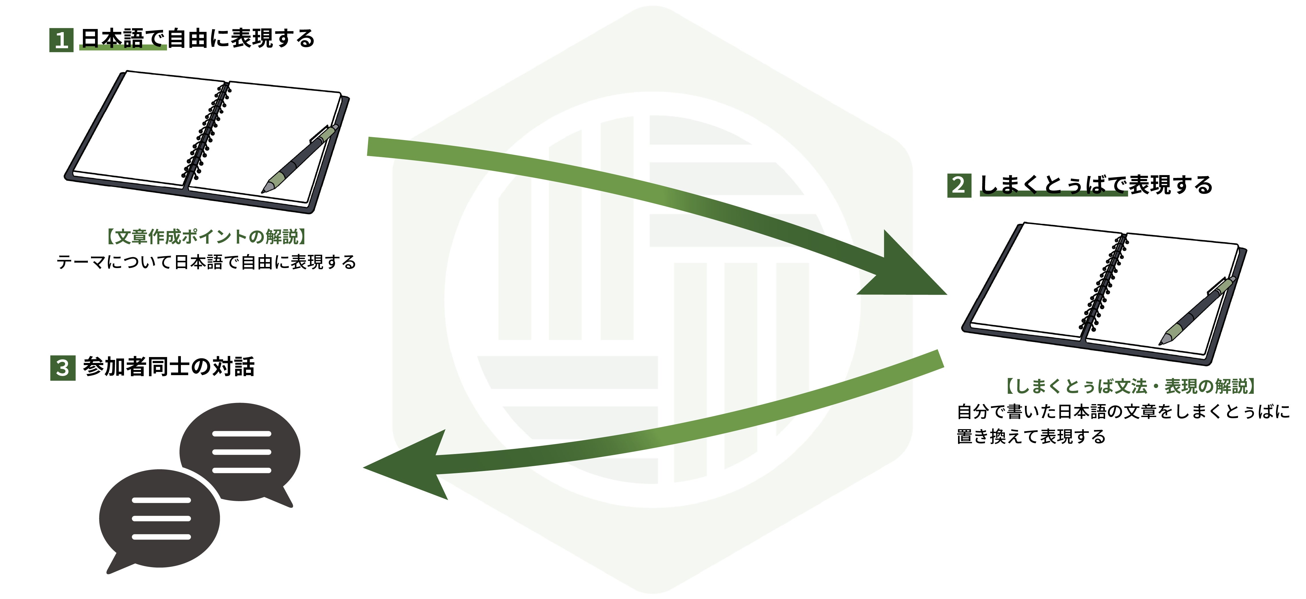 中級コースでは表現することに焦点を当て、日本語と沖縄語を往復しながら表現の揺らぎや多様なあり方を実感するとともに、対話を通じて「生きた言葉」としての沖縄語を身につけていくことを目指します。