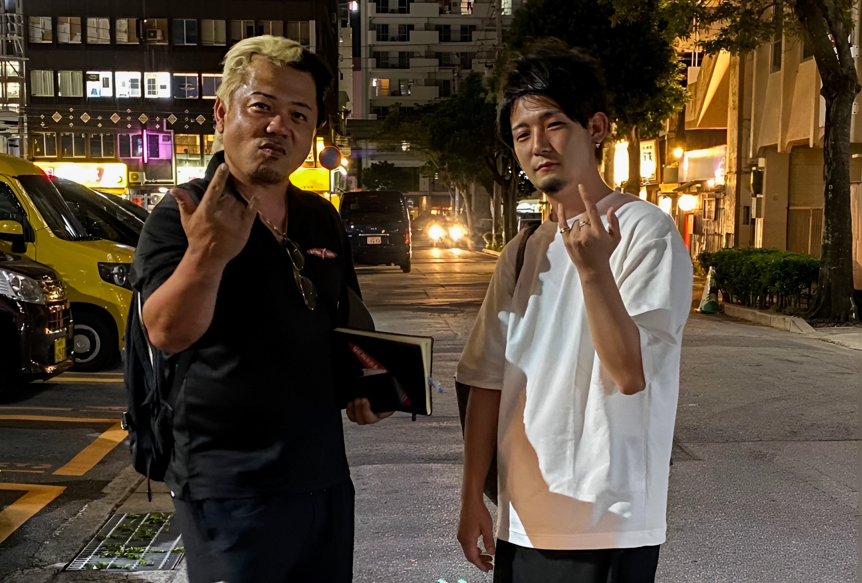 「沖縄サムライ」MGさん(左)と「子どもたちが方言を徐々に徐々に知らなくなってきている。今こそ方言塾ってあってもいいと思うし、今しかない。一大事だよ。自分たちは方言を聞けるけど、上手くは喋れないわけよ。