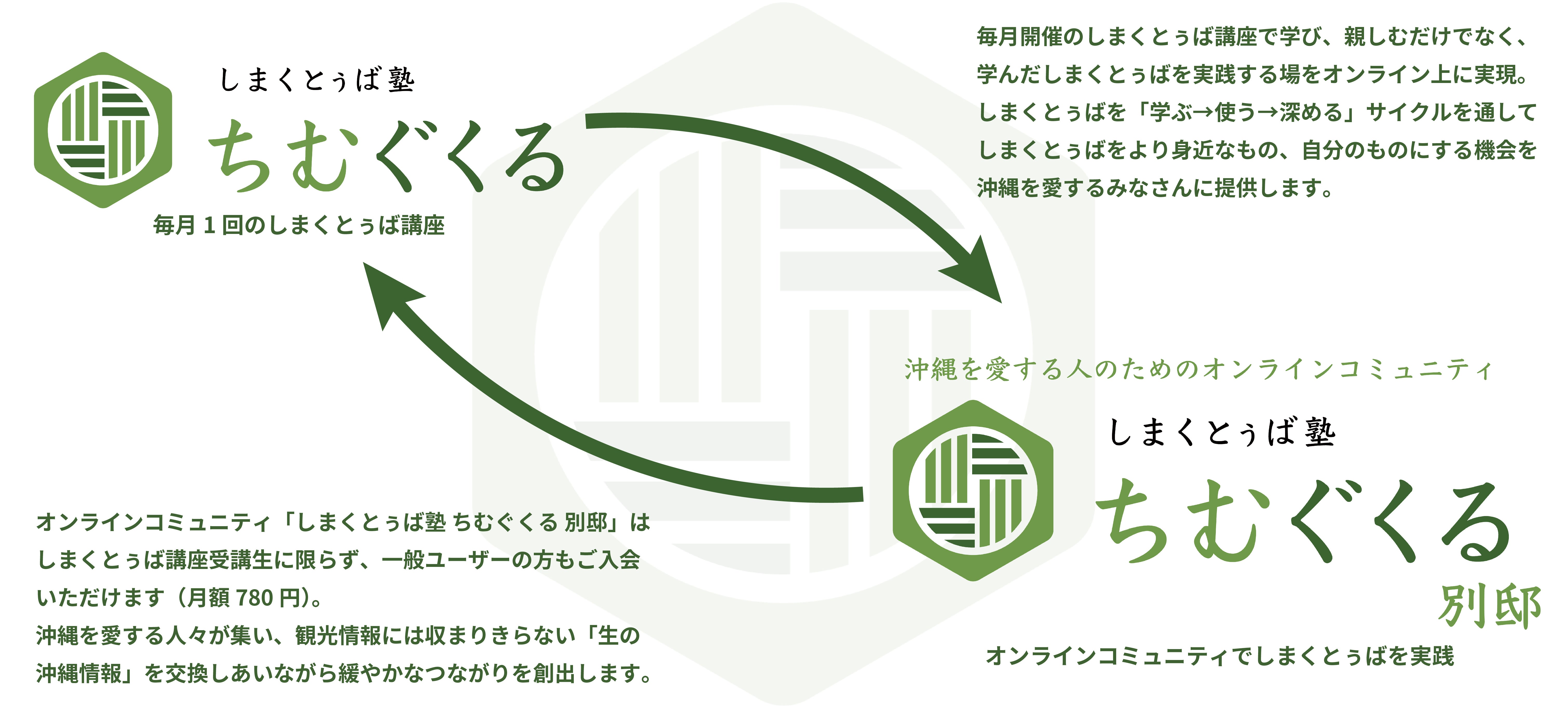 毎回の講座は那覇市内の会場+オンライン同時配信の形で、どこにお住まいの方であっても受講できます。また、日常生活の中で使うにはまだハードルが高い現状でも、しまくとぅばを用いることのできる場としてオンラインコミュニティ「しまくとぅば塾 ちむぐくる 別邸」を用意しています。