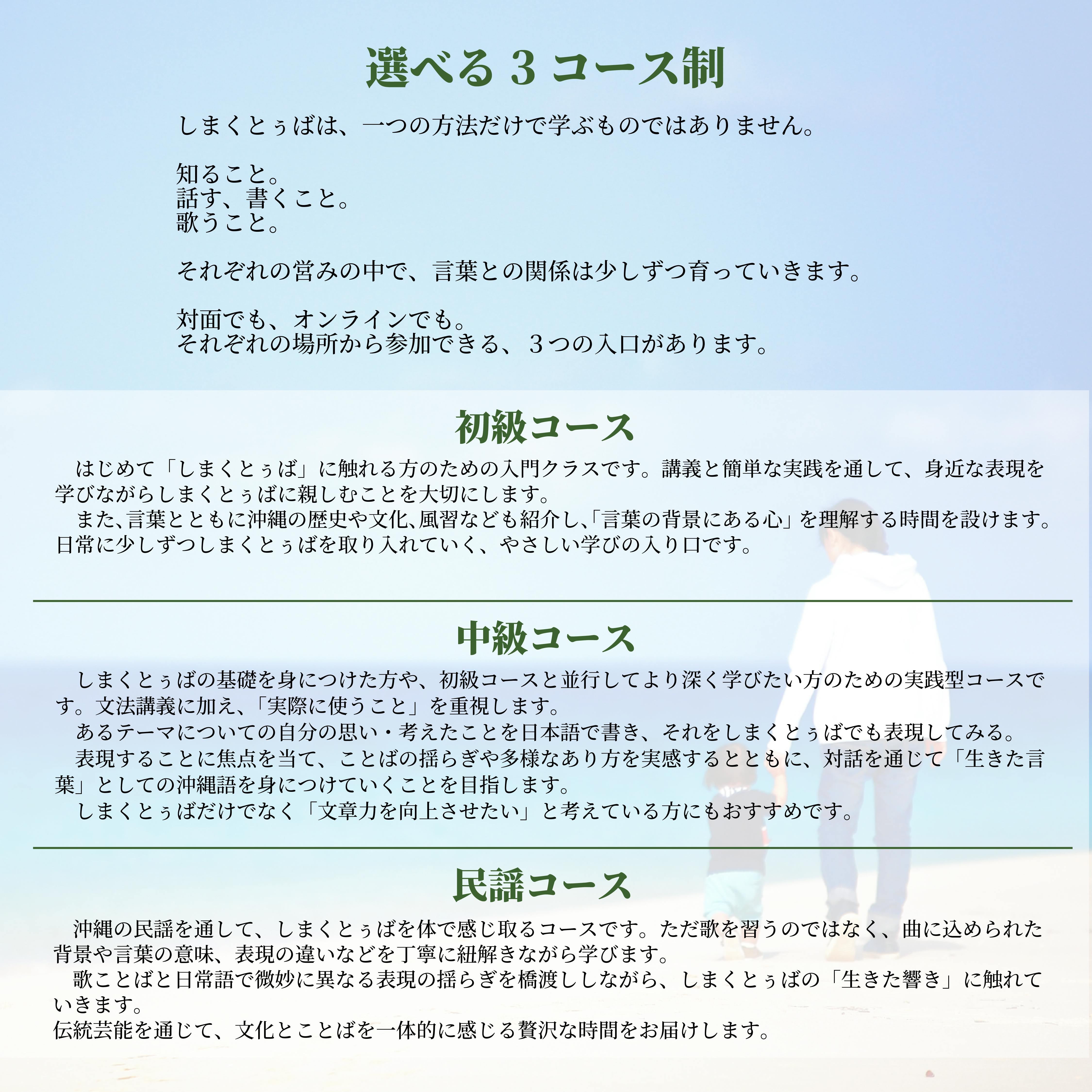 対面+オンラインで全国どこからでも受講可能なスタイルはそのままに、これまでの学びを土台としながら、より多くの方々が日常の中で「しまくとぅば」に触れ、使い、次の世代へと手渡していける環境を整えていきたいと考えています。